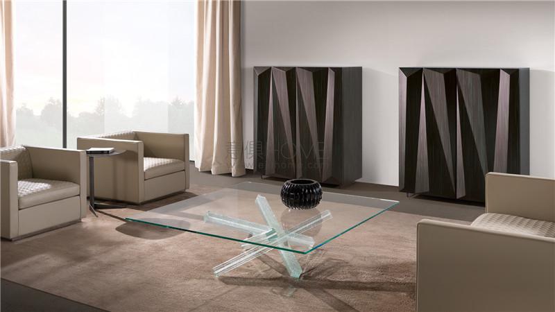 Wooden cupboard with 2 doors available in Canaletto walnut, matt lacquered or in satin brass or titanium finish. Glass shelves inside. Legs in transparent glass or in brass or titanium finished metal.