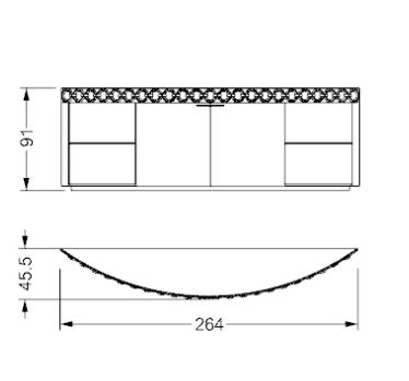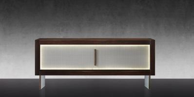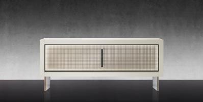 Sideboard with structure in shiny lacquered wood or in shiny ebony wood. 2 doors in Dune, San Marco or Vienna pattern design glass with shaped handles, metal frame and LED lighting. Legs in extraclear glass matching the door pattern.
