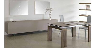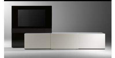 Sideboard with 2 sliding doors covered in lacquered or etched lacquered glass. Optional legs in transparent glass or in brass or titanium finished metal.