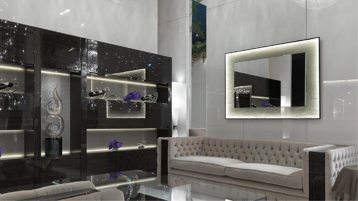 Mirror in extra-clear glass 5 mm thick with 45° bevel.Glass frame with Dune, San Marco or Vienna pattern design and metal profile in burnished brass finish with LED light.;