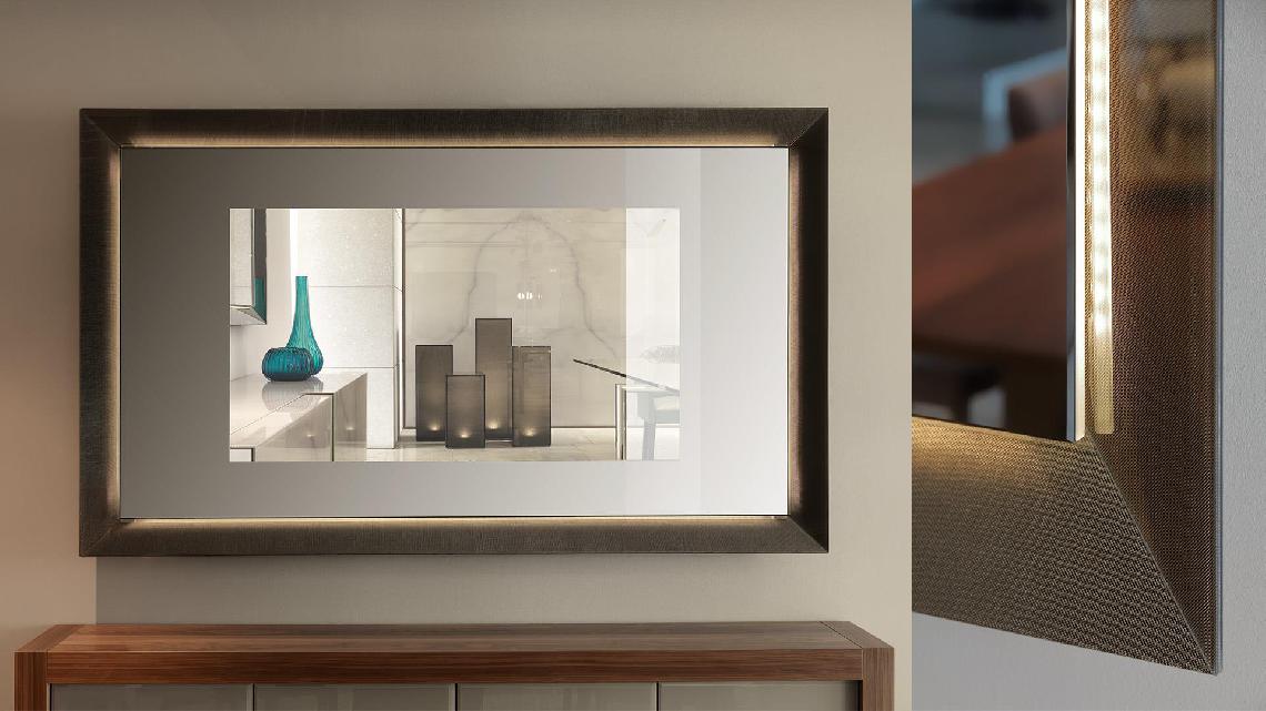 Collection of mirrors, also as TV-mirror, with a glass frame available in: mirror, smoked-mirror, lacquered or etched lacquered finish, Mesh glass or in the new satin brass or titanium metallic finishes.