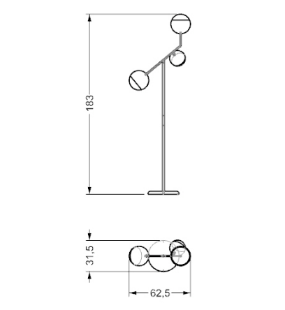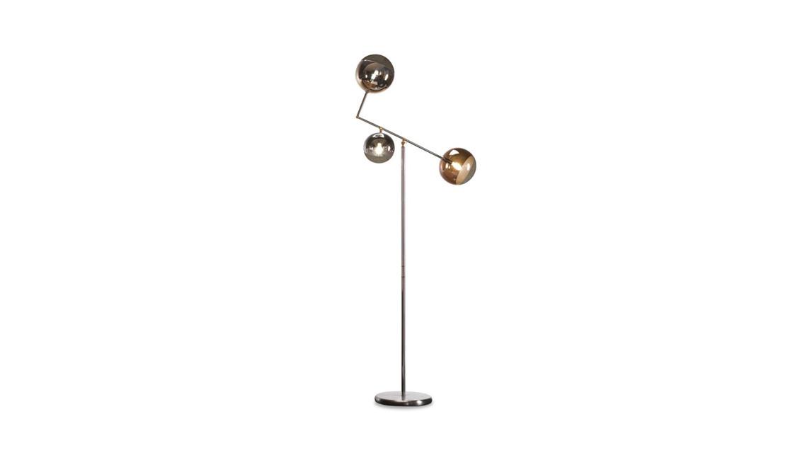 Floor lamp with metal structure in satin finish brass or dark titanium with adjustable inclination. Details in brass. 'Light filter' spheres in borosilicate glass: 1 x ?16 cm in silver - 2 x ?20 cm in gold and bronze. LED lighting
