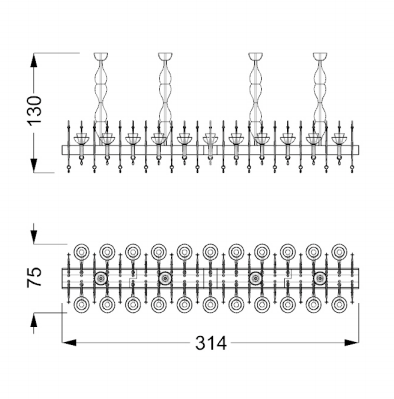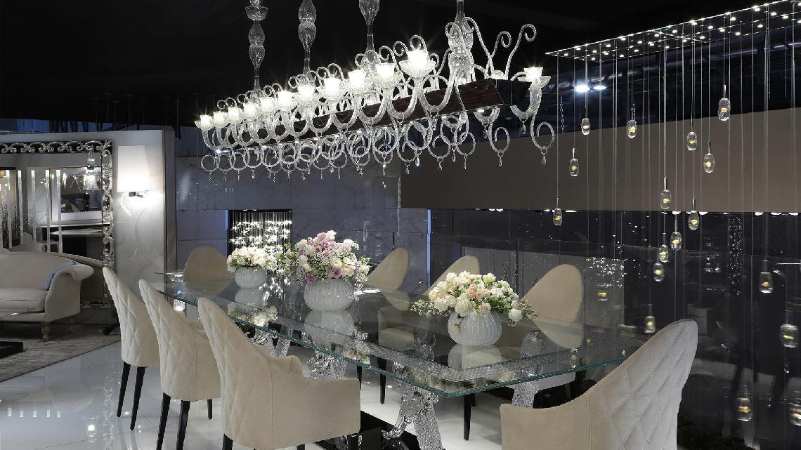 Modular chandelier composed by elements in engraved crystal and arms and pastorals in transparent Murano glass. Metal support covered in smoked mirror glass with Diamante engravings. Available in rectangular shape with 10 lights to be extend thanks to a connecting element with 2 lights or in round shape with 8 lights. Lighting system with Led bulbs