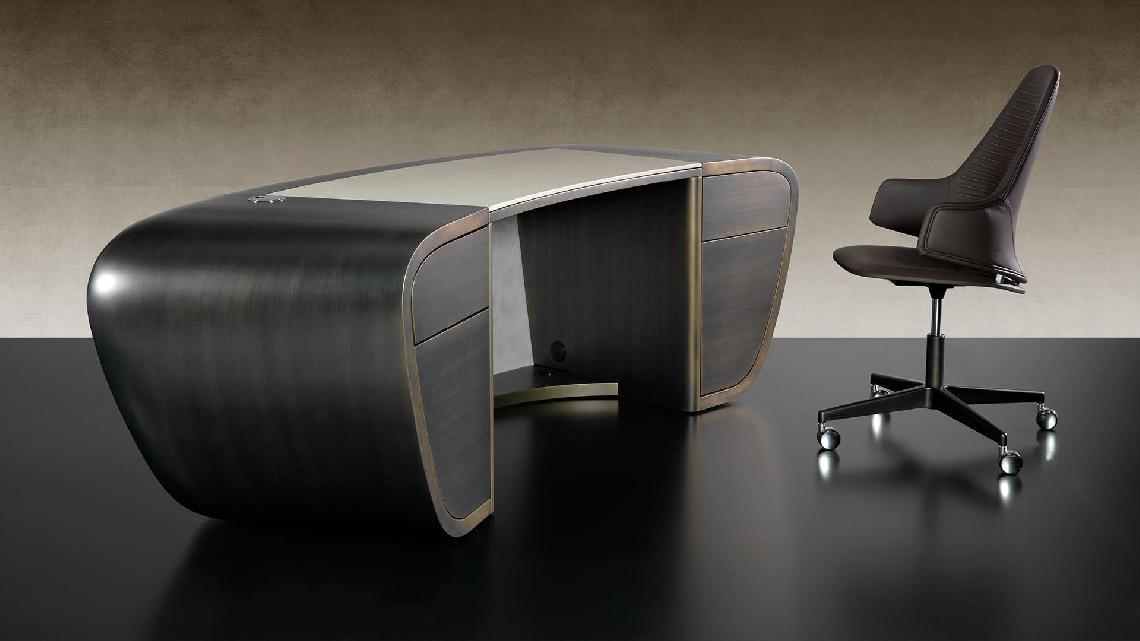 Desk with curved structure available in matt lacquered finish or in satin brass or titanium finishes. Frontal section covered with leather. Top covered with leather or in same finish as the structure.
