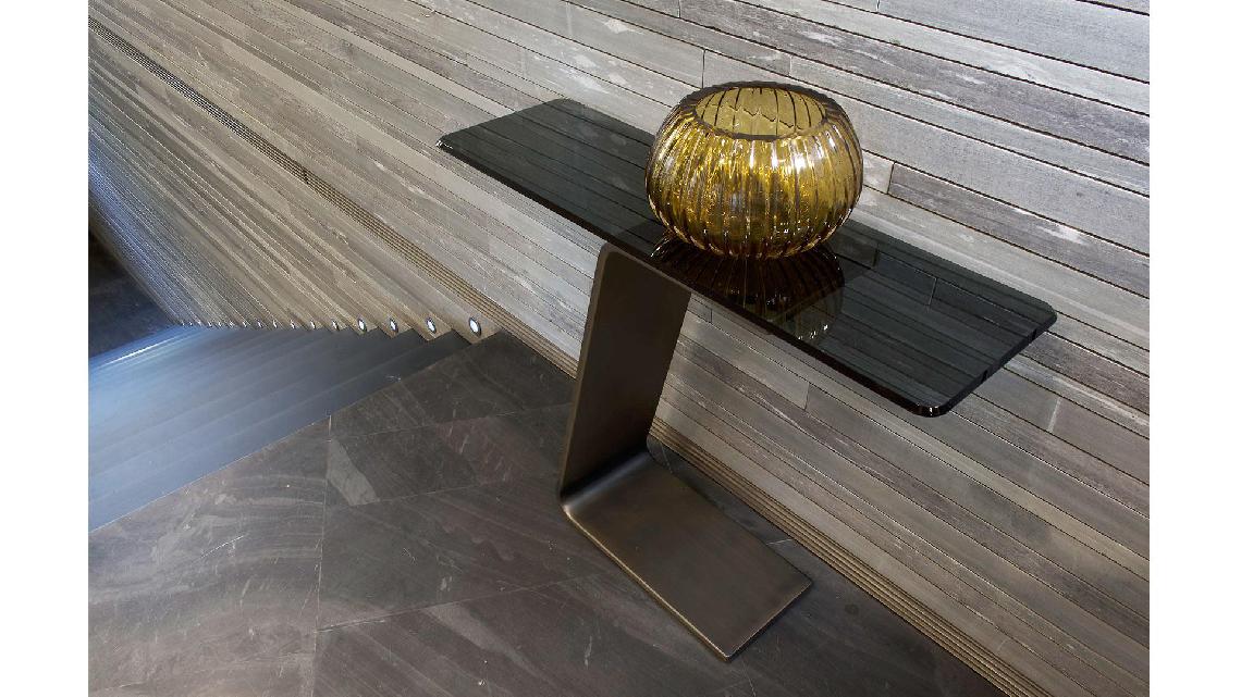 Console in curved extra clear glass 15mm in Bronze, Brass, Dark brass, Titanium finish.Top in smoked glass 10mm thick with 45° bevel or in Marble glass 4+8mm thick Wing edges.