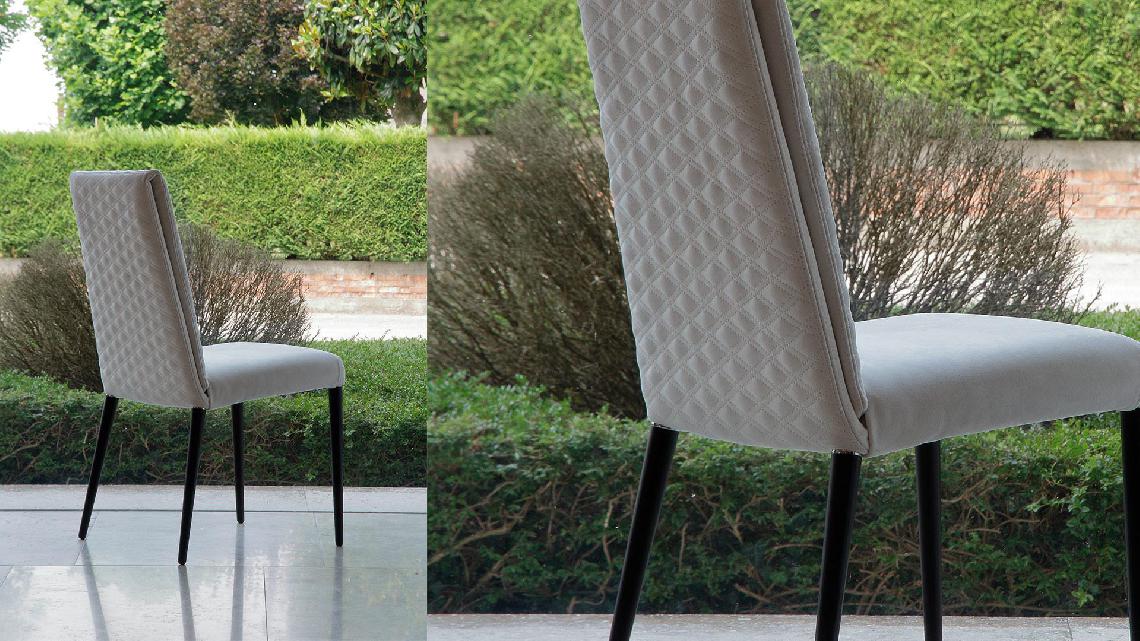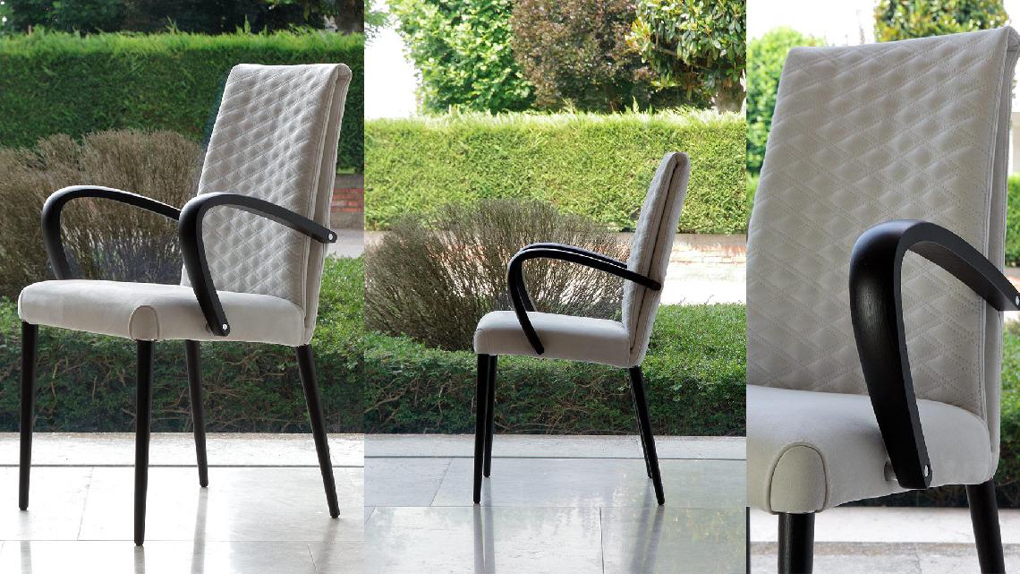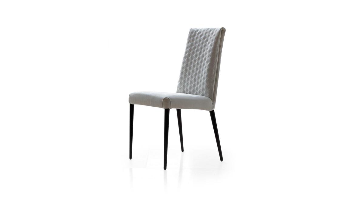 Chair with internal metal structure and upholstery in leather or fabric with Emerald quilting on the backrest. Upholstered legs or in shiny nero beluga lacquered wood, Canaletto walnut or matt beluga Oakwood. Also available with armrests in matt Beluga oakwood finish