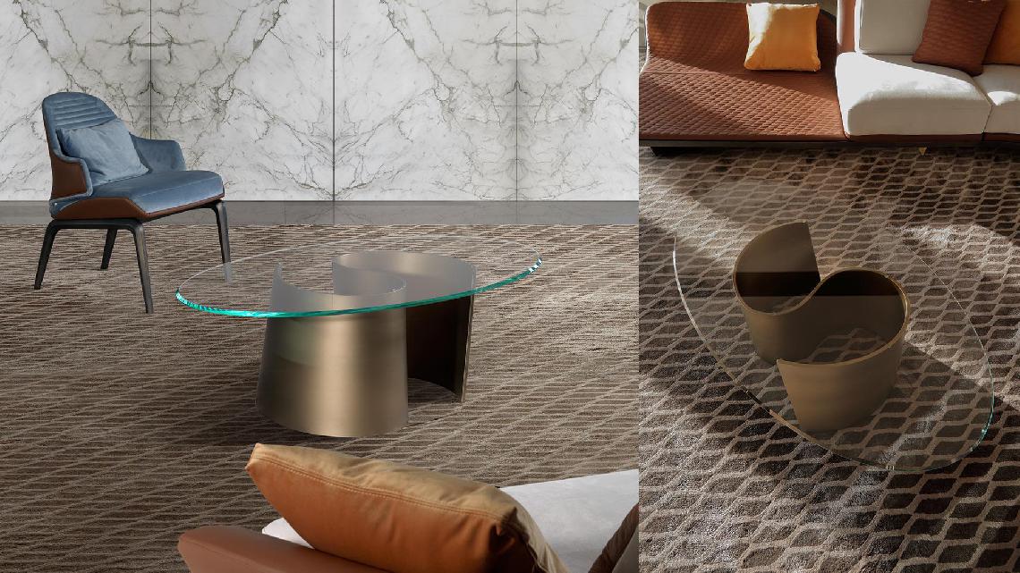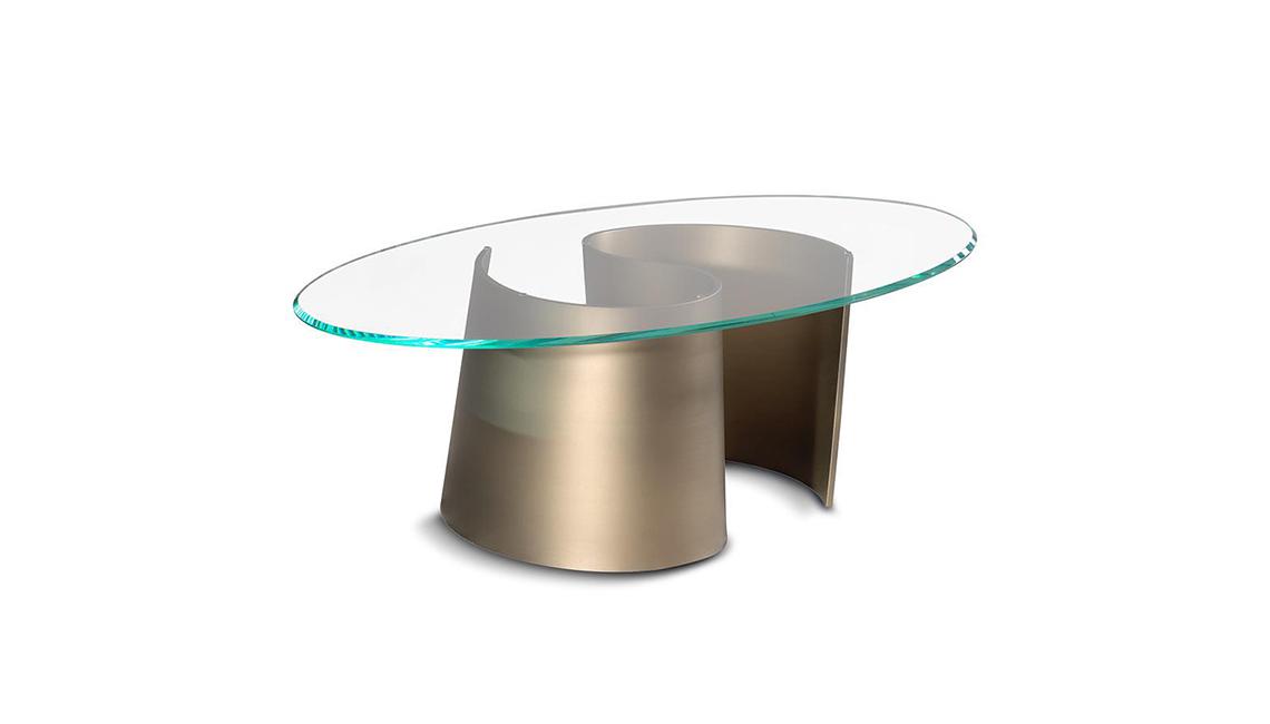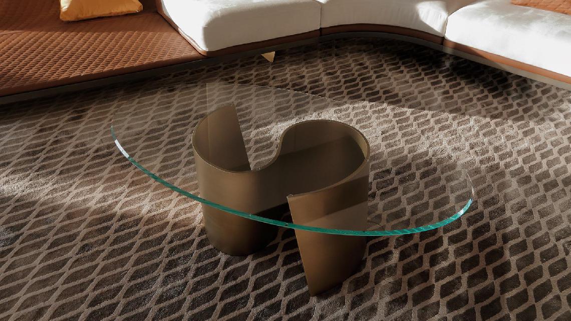 Coffee table with base in curved extra clear glass 12mm thick with Bronze, Brass, dark Brass, Titanium.Glass top 12mm th., polished edges or 45°bevel optional.