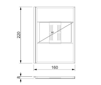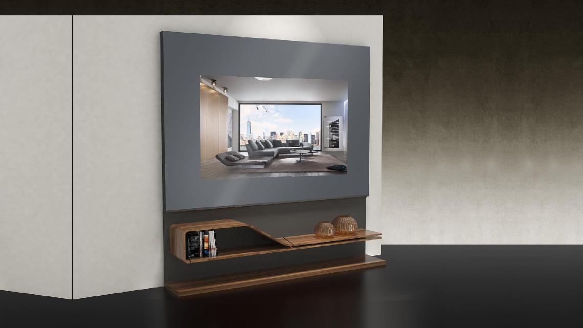 Mirror/TV container in Supersilver mirror with black serigraphy for LED TV (7cm maximum thikness) with frames in matt lacquered wood Henné colour. Joint to a special module of Segno Libreria (Pininfarina design) with shelf available in matt lacquered finish, Henné oakwood, Canaletto walnut or in a mixed combination of ebony wood and shelf in satin brass finish.