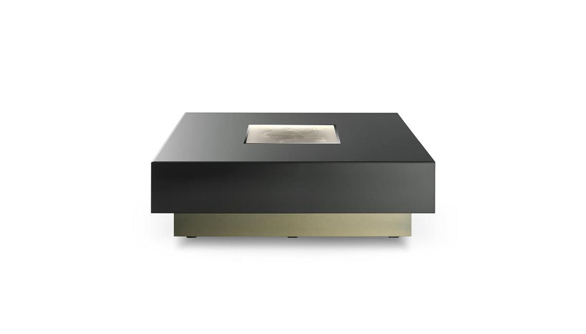 Coffee table with wooden plinth in satin brass finish. Wooden top in shiny lacquered finish covered in lacquered glass or in shiny ebony with a tile in engraved glass in the centre.
