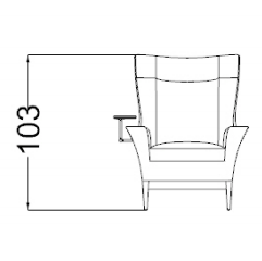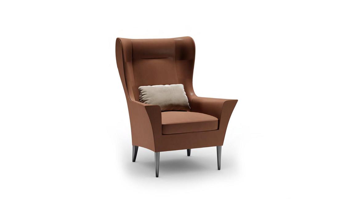 Bergère with structure in wood and rigid polyurethane. Seat cushion with feather padding and polyurethane insert. Upholstery in fabric or in leather. Wooden legs in satin brass or titanium finish and optional glass-holder.