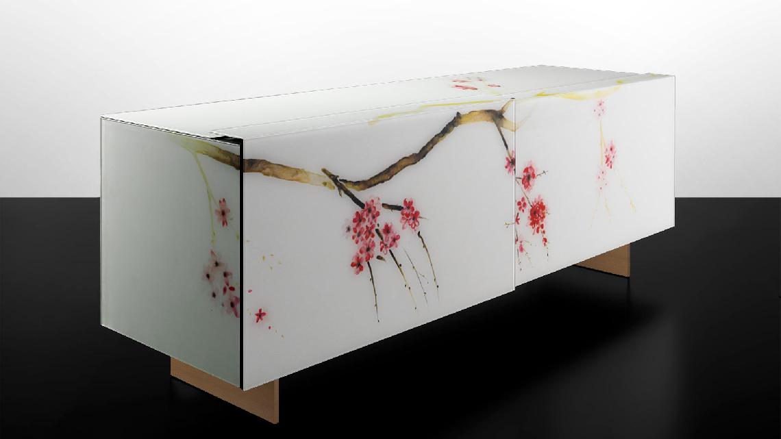 Sideboard with 2 sliding doors, covered in etched glass with decorative art printing.Optional legs in transparent glass or in brass or titanium finished metal