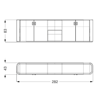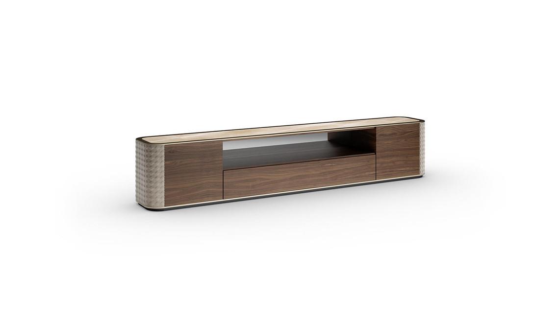 Buffet with wooden structure. Doors with push-pull opening. Sides covered with leather. Top in Marble glass with profile in satin brass finish. Intnal shelves in glass.