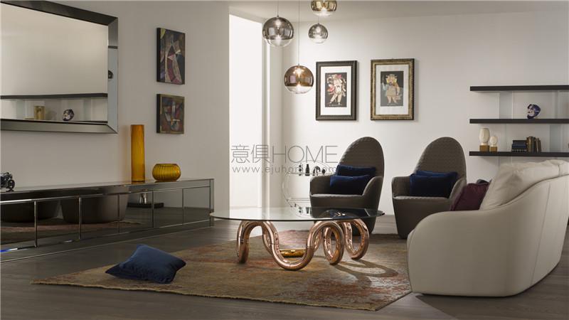 Coffee table with base made of curved elements in wenge finish, satin brass or dark brass, shiny copper or shiny black nickel finish. Glass top 12 mm thick.