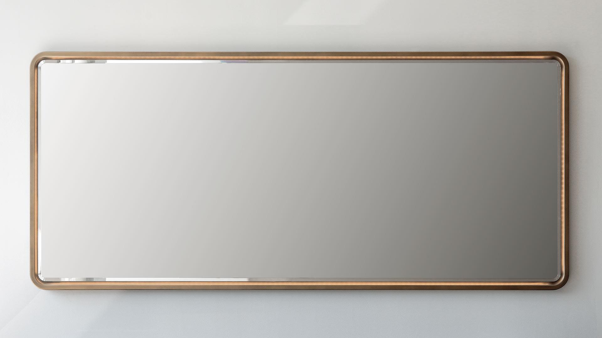 Collection of mirrors in extra clear 5mm thick glass with shaped wooden frame in the satin brass or titanium metallic finishes.Optional LED lighting.