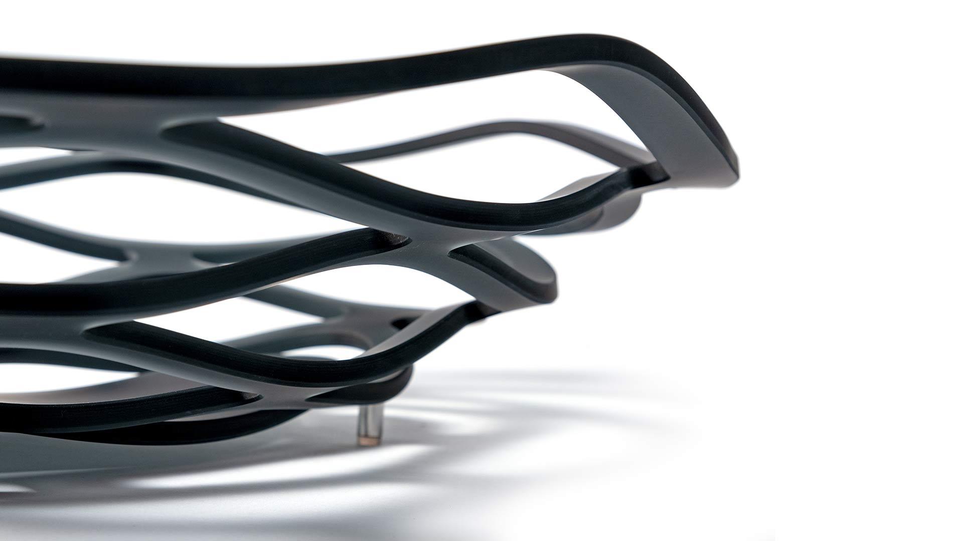 Fruit-bowl in curved extraclear, bronze or smoke-grey glass with etched finish.