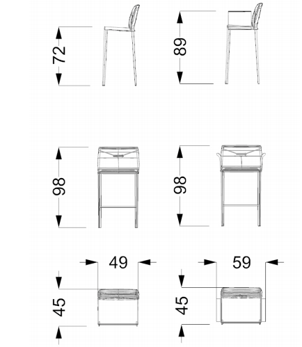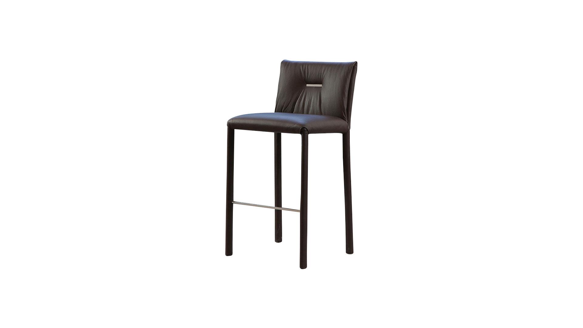 Bar stool with internal metal structure and upholstery in leather or in fabric. Shiny steel detail on the back and upholstered legs. Available with upholstered armrests.