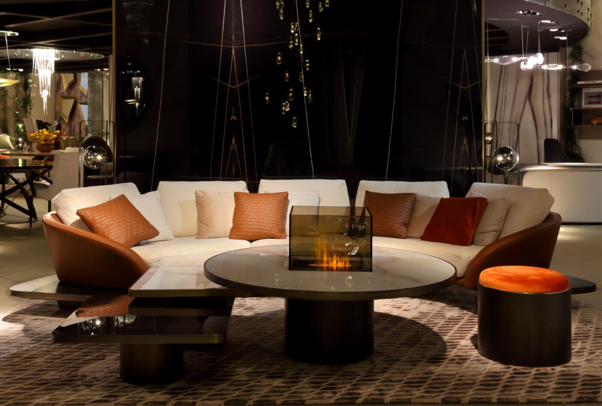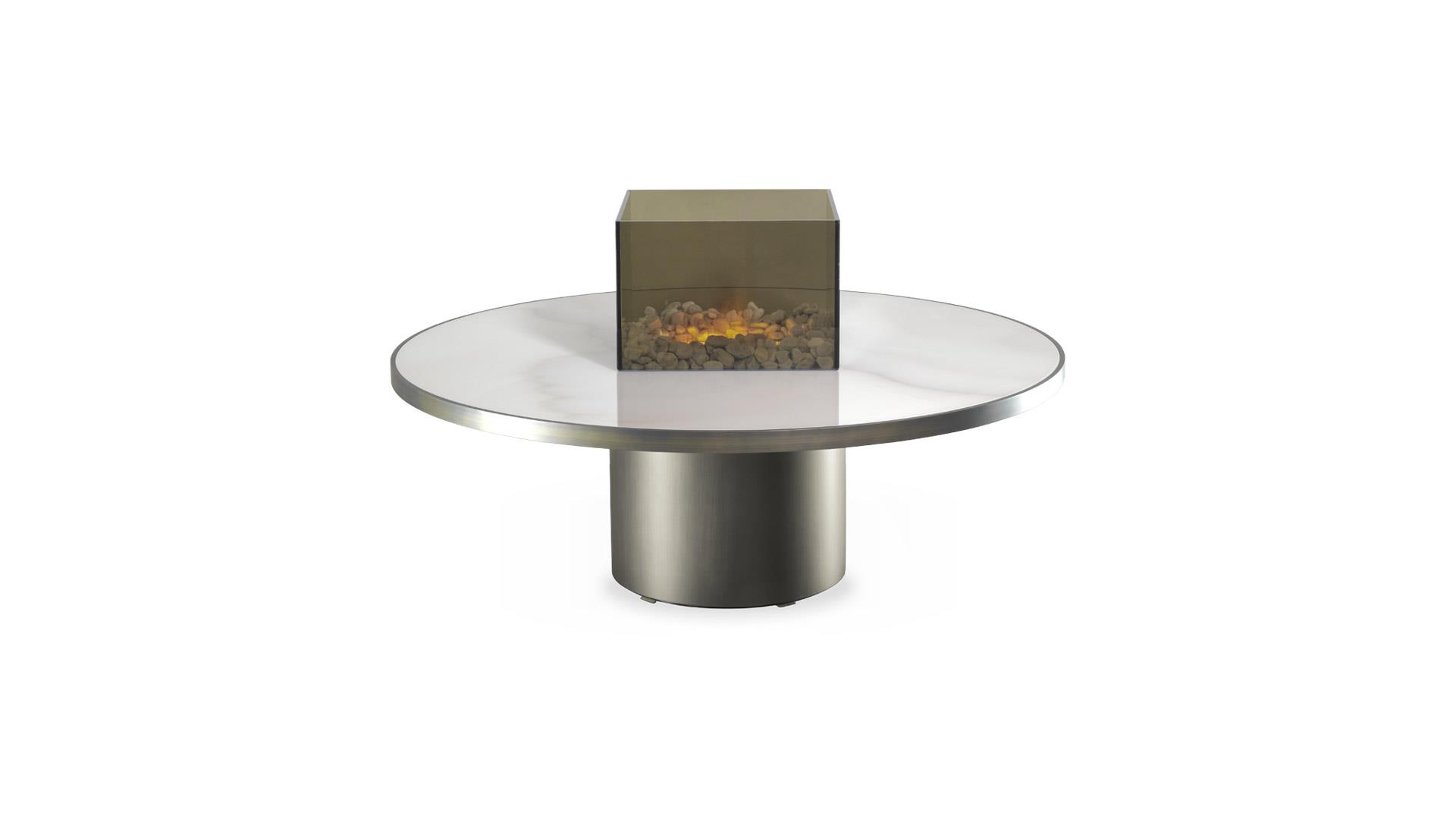 Coffee table with cylinder base in the satin metallic finishes. Wooden top in same finish with 40mm thick edge with inlay in lacquered or etched lacquered glass or in Marble glass. Equipped with an electrical water fireplace in the central hole.