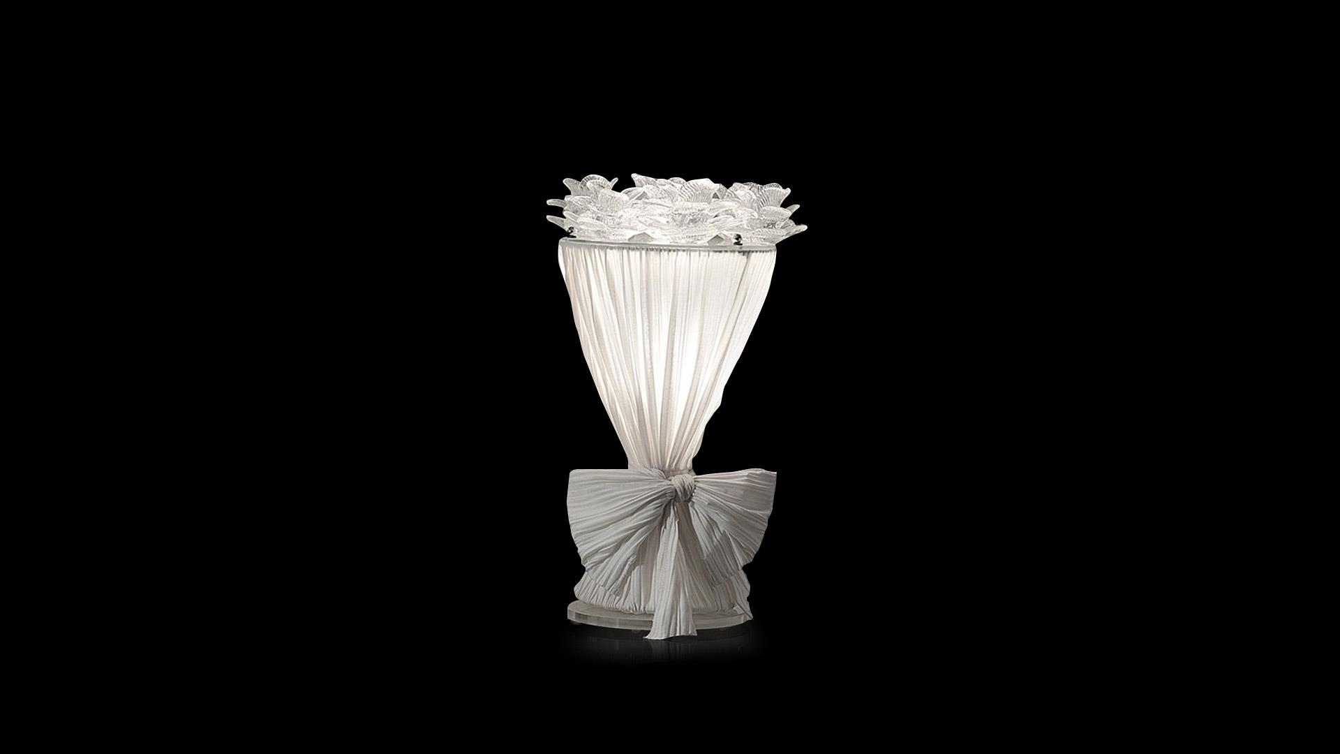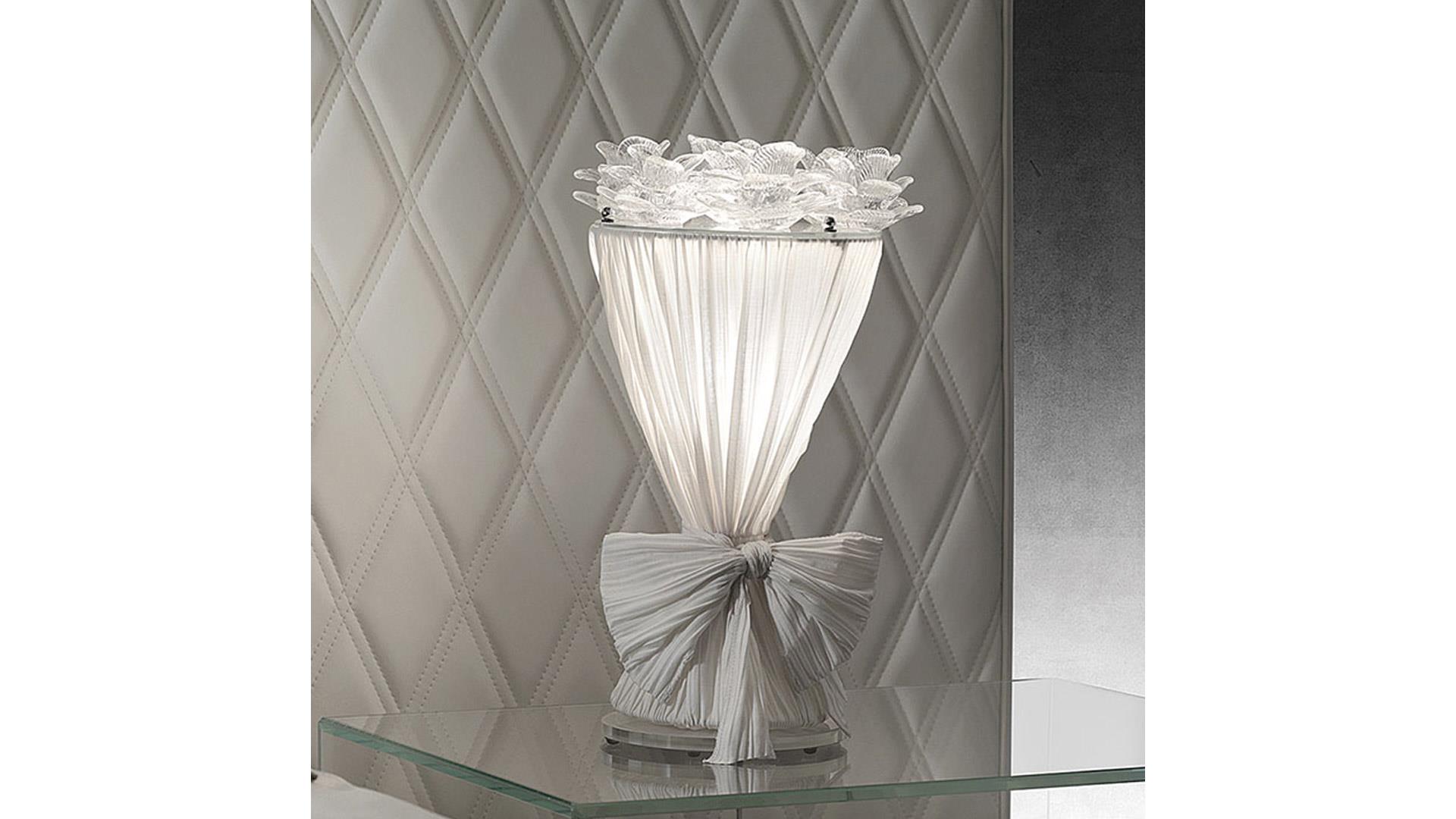 Table lamp with base in mirror glass. Iron support with lampshade in ivory pleated fabric and cover in sandblasted glass with flower decorations in transparent Murano glass. LED system