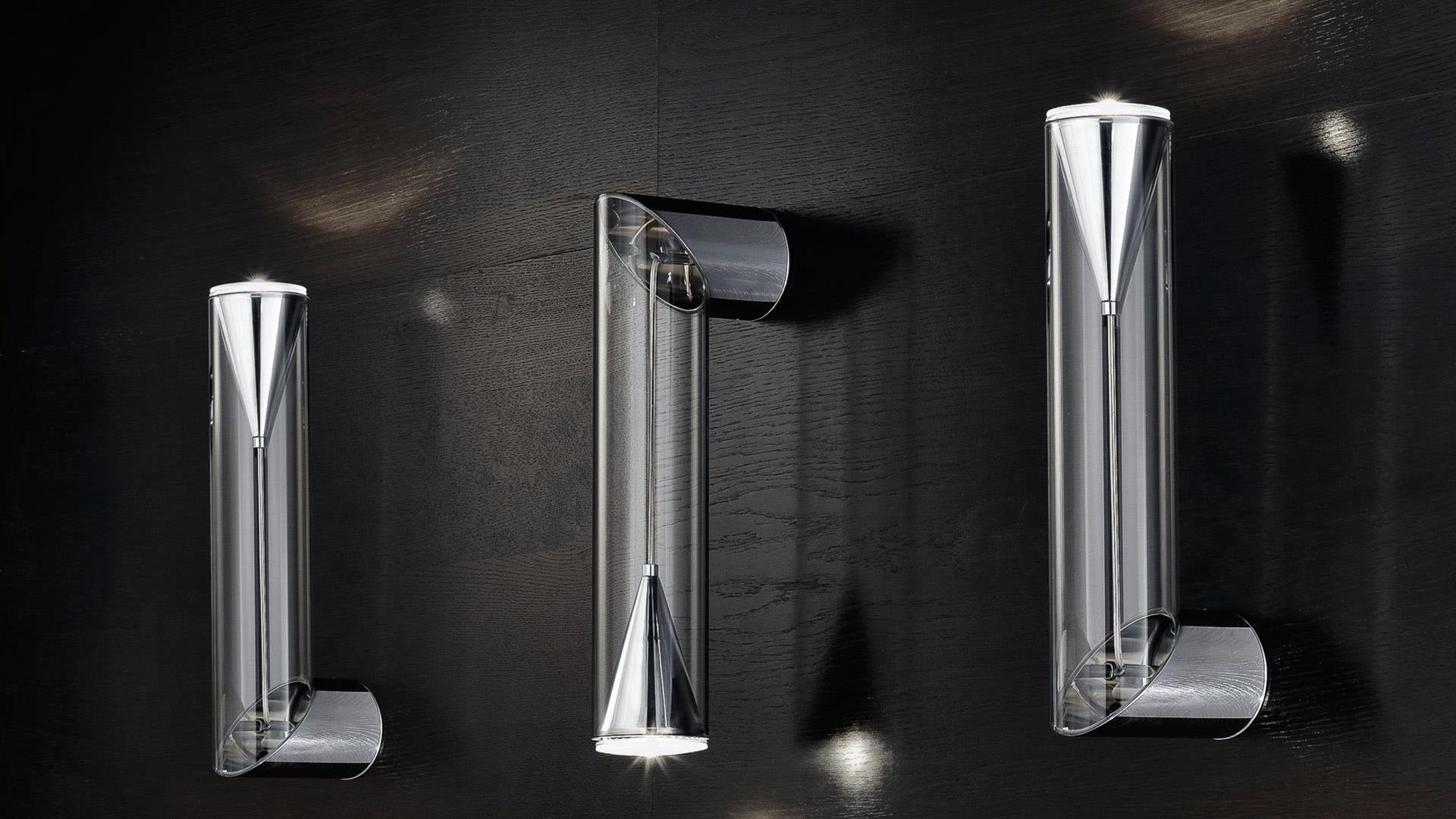 Wall lamp in transparent borosilicate glass with chromed support. LED system
