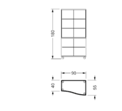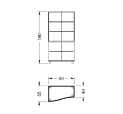 Vetrina sagomata con top e mobile inferiore con ante in legno laccato opaco nero beluga o bianco. Fianchi, schienale e ante superiori in vetro trasparente sp. 6 mm. Ante superiori con serratura. Ante inferiori apertura push-pull. Ripiani regolabili.