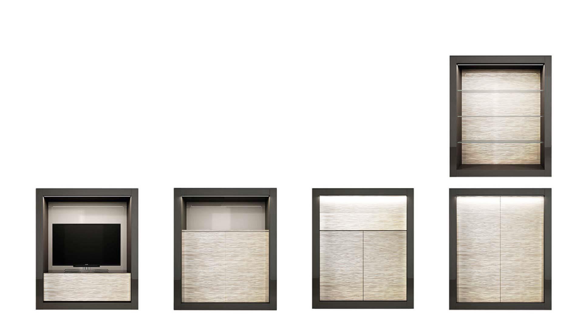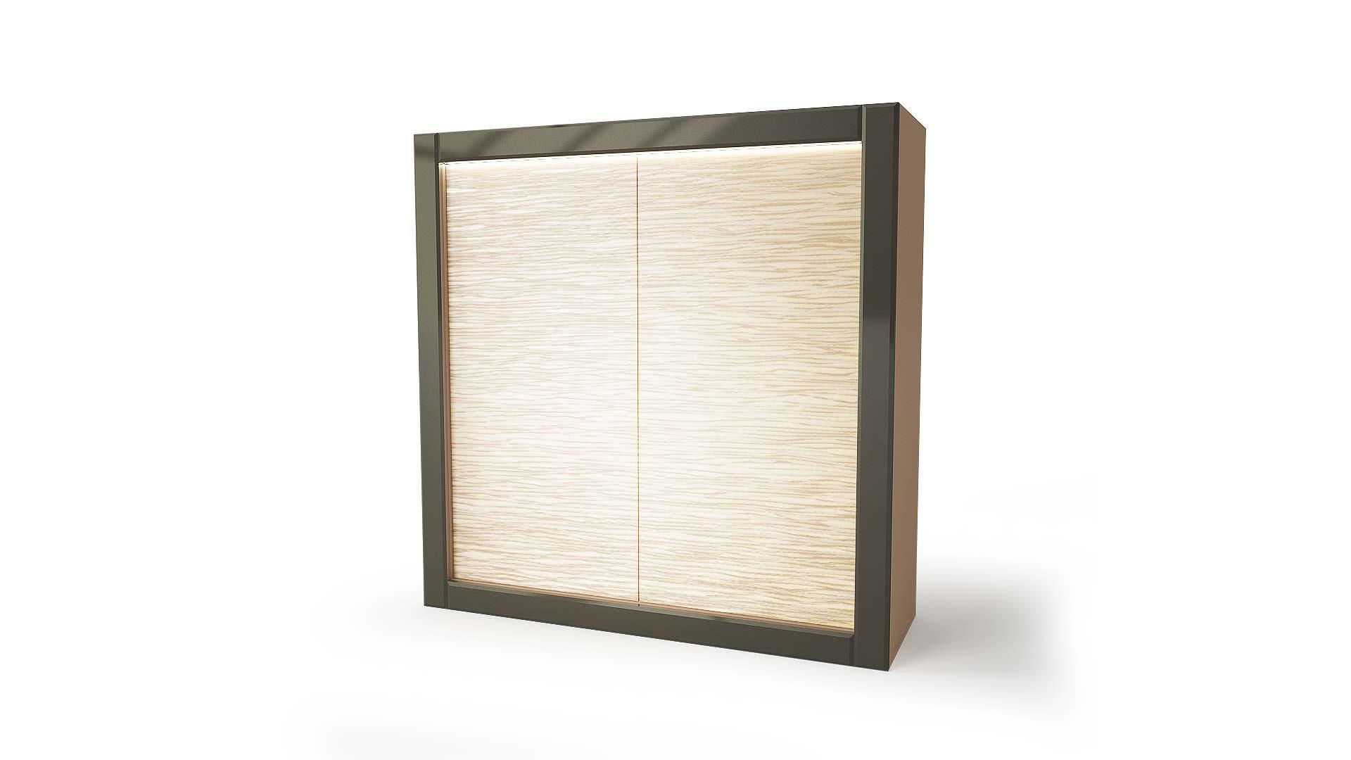 Elemento con struttura in legno. 2 ante in vetro decoro Dune. Illuminazione LED.Modelli disponibili A, B, C, E