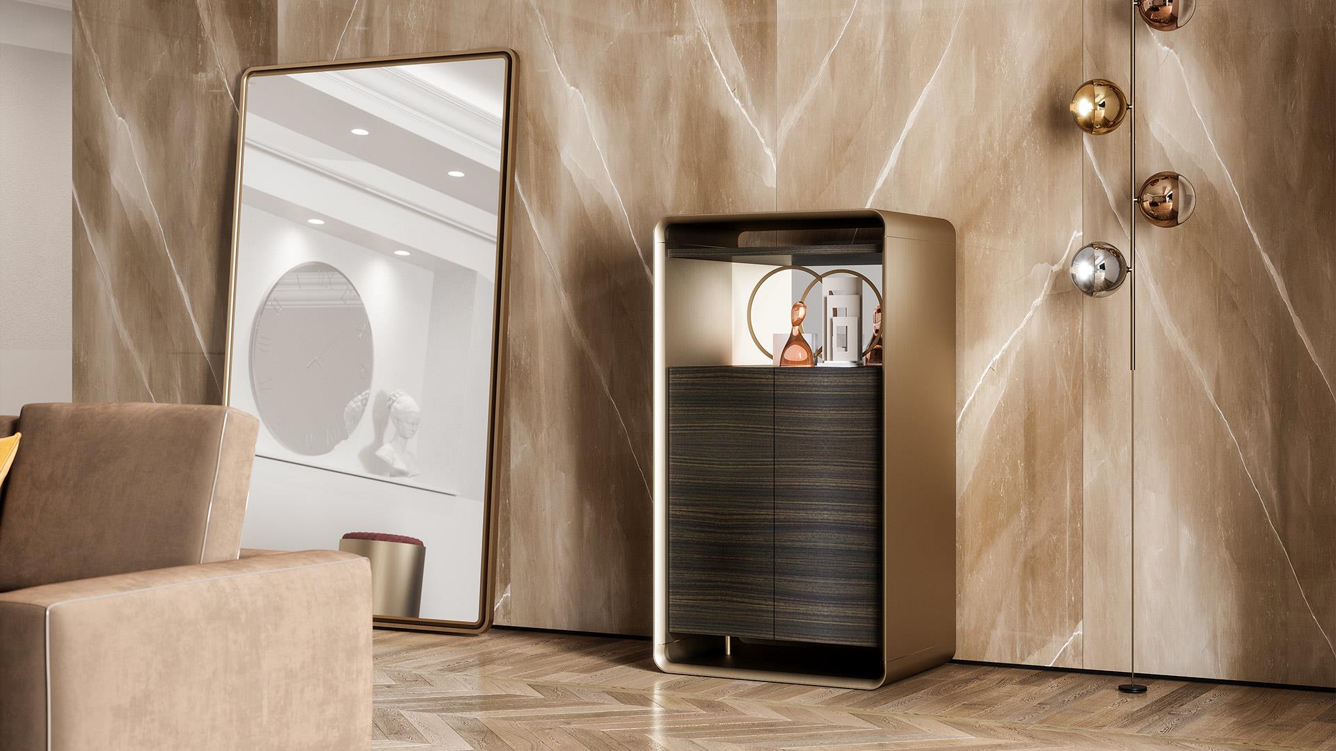 Cupboard with structure in shaped rounded wood in Bronze, Brass, dark Brass, Titanium finish.