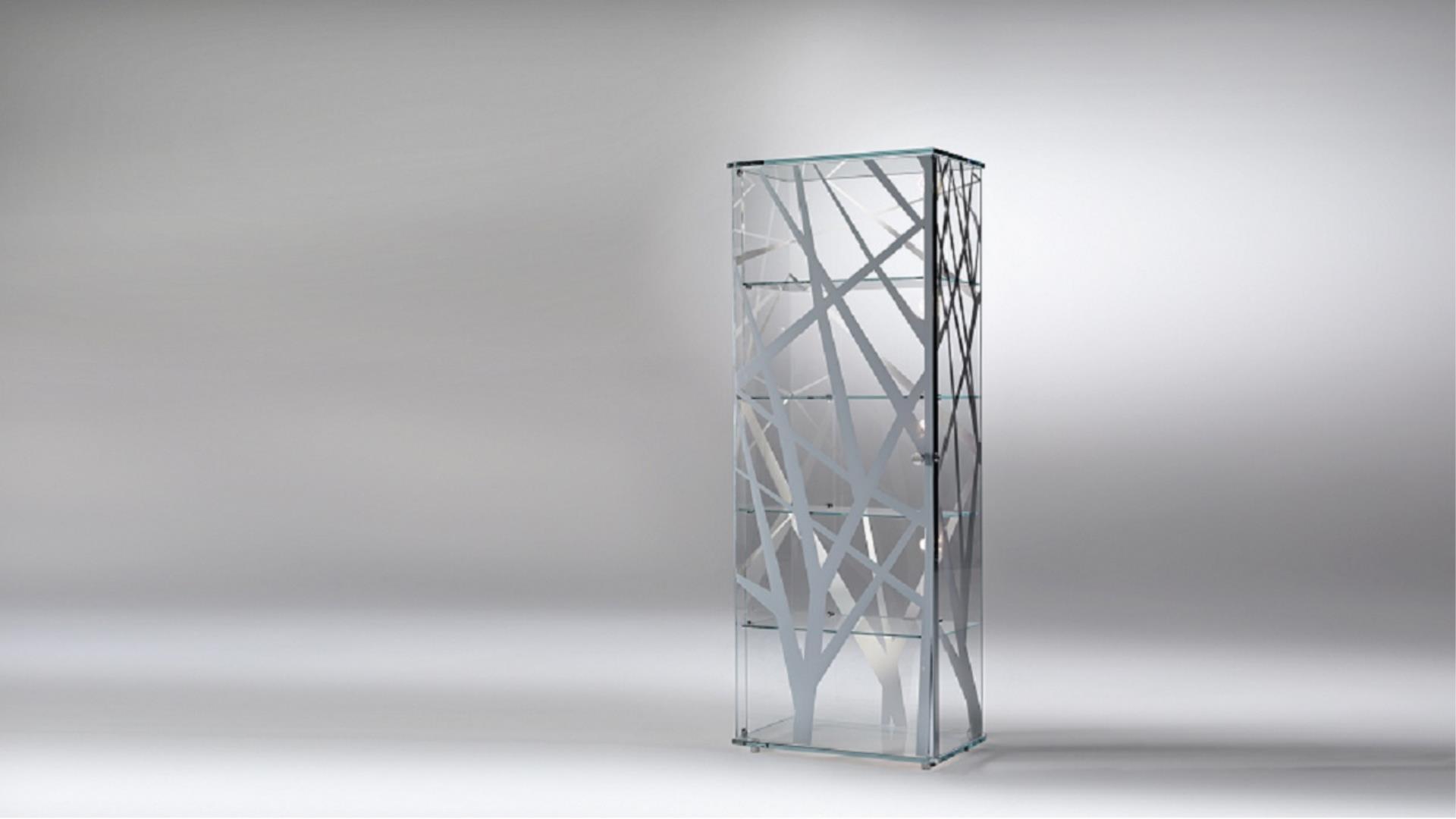Collection of display cabinets in extraclear transparent glass. Available in two different heights with adjustable metal feet or with metal base. Doors with lock and optional lighting system.