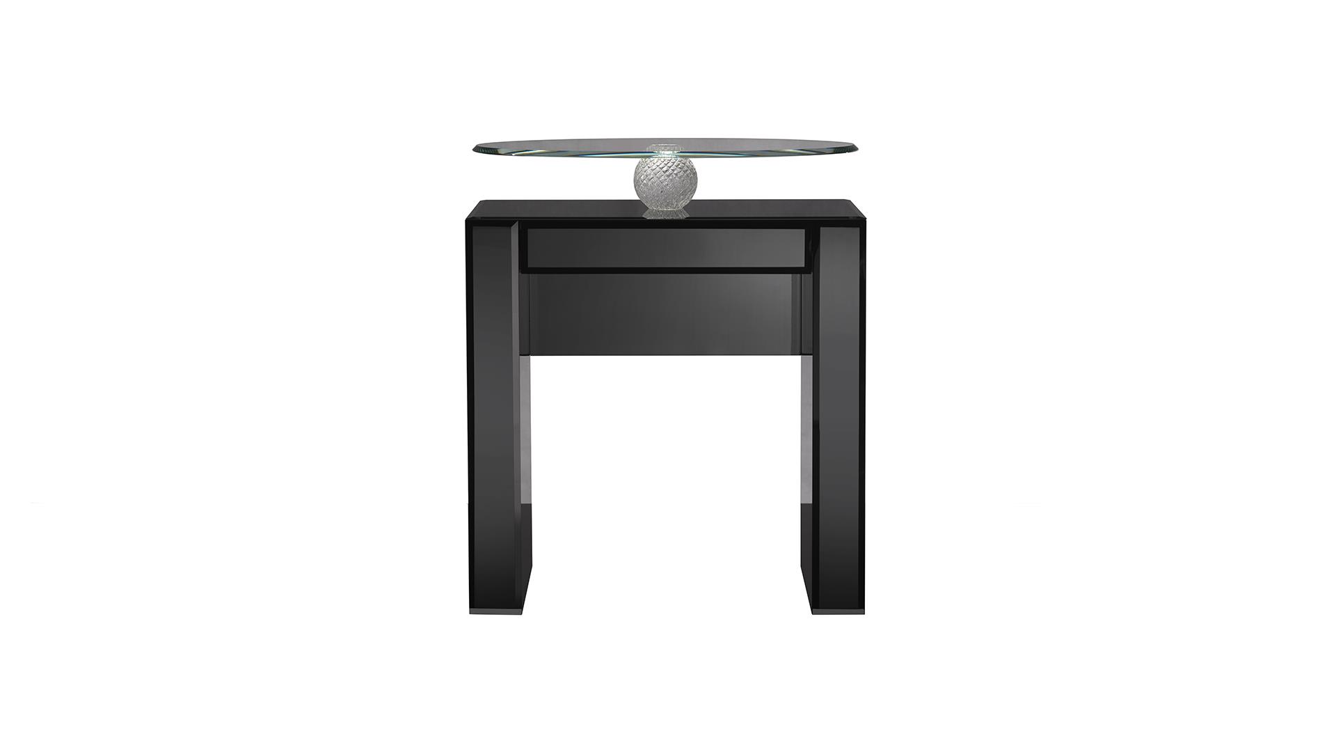 Nightstand with 1 drawer in wood available in shiny lacquered or in shiny Ebony with bevelled lacquered glass details. Upper oval top in extra clear glass 10mm th. supported by a sphere in transparent, gold, black, blue-grey, amber, red, tobacco, amethyst Murano glass. Optional pendant handle in transparent Murano glass, round crystal handle and LED lighting on the sphere.