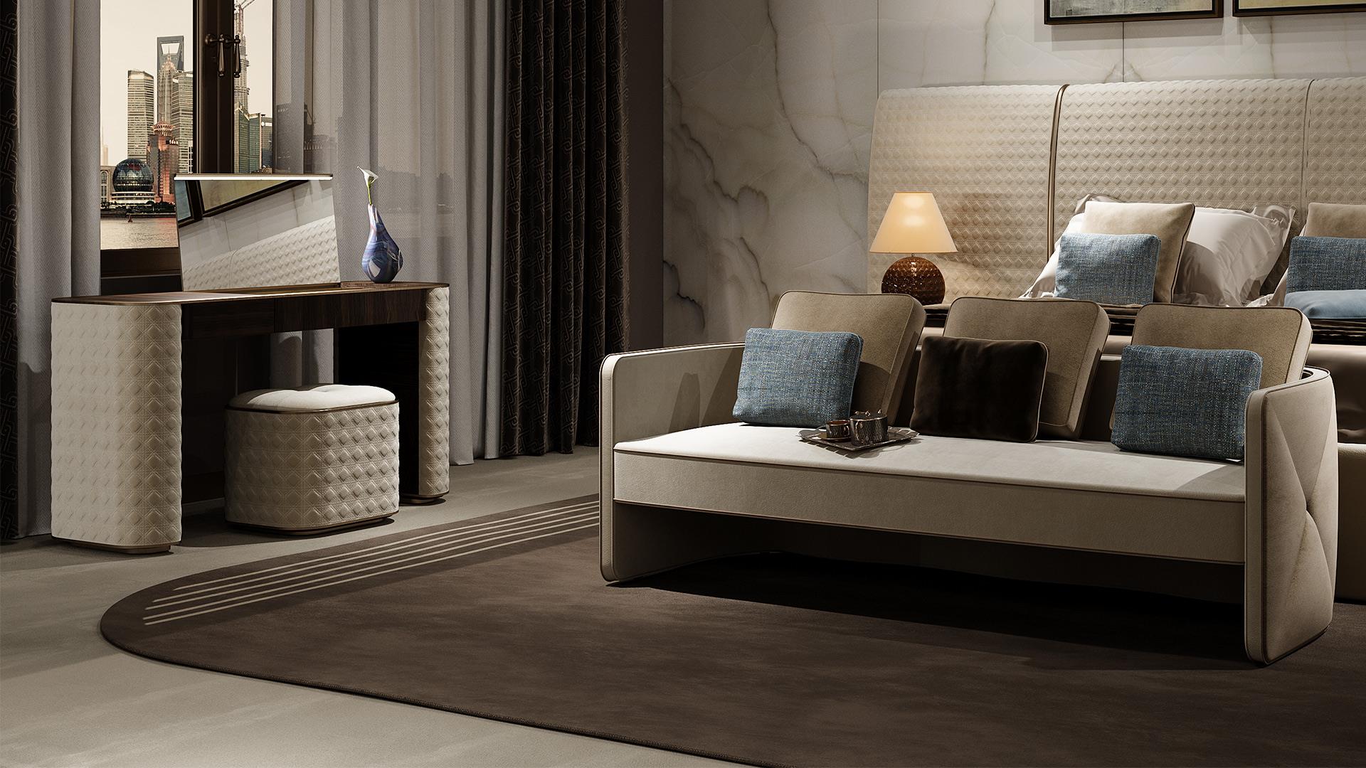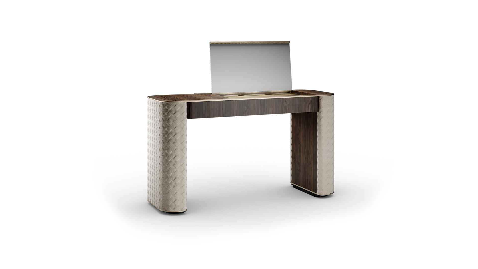Profile on the top in the satin brass finish and sides upholstered in San Marco quilted leather or fabric.