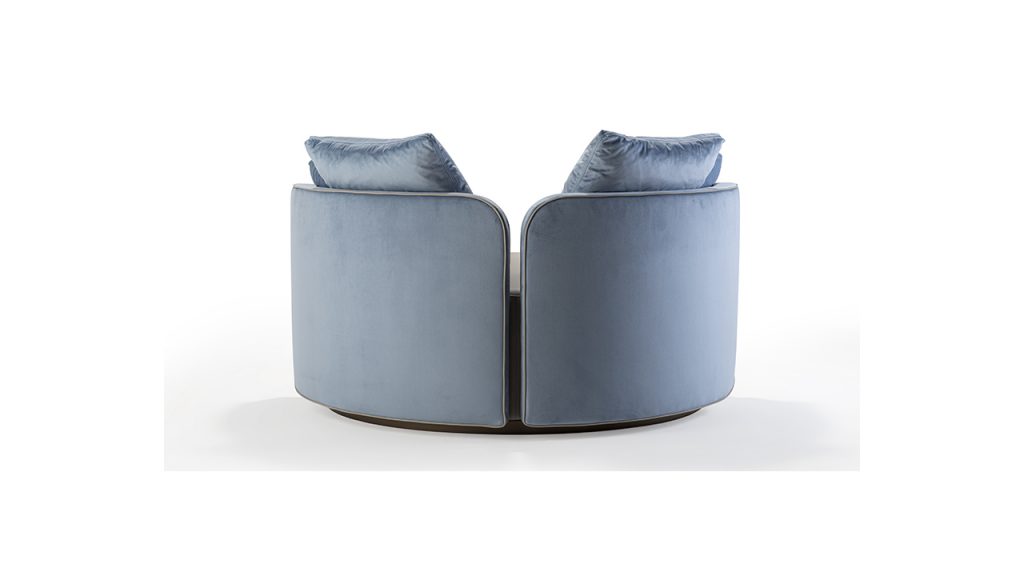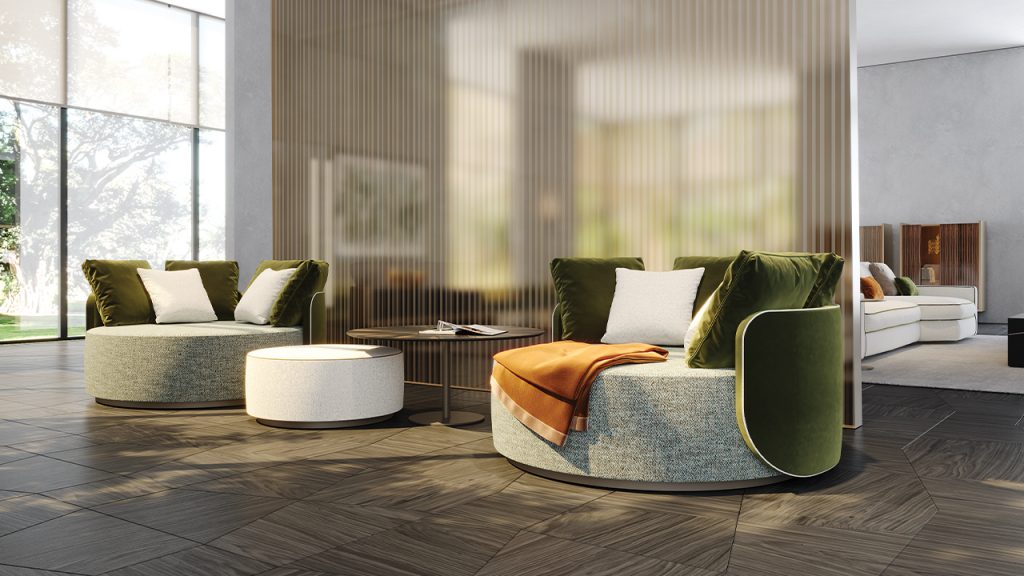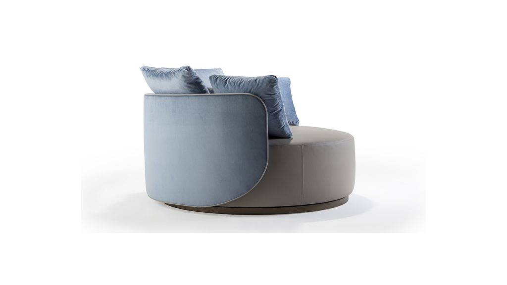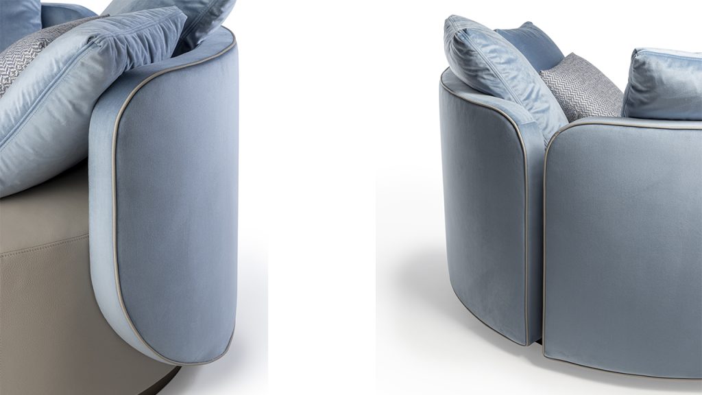 Poltrona girevole imbottita e rivestita in pelle o tessuto. Base in finitura Bronze (100M).