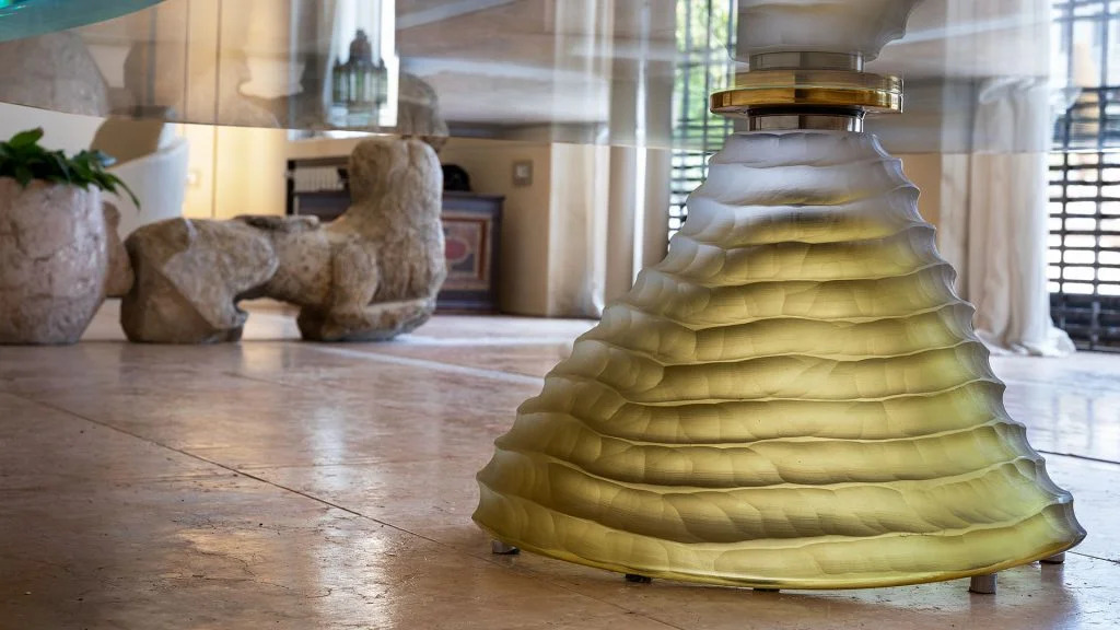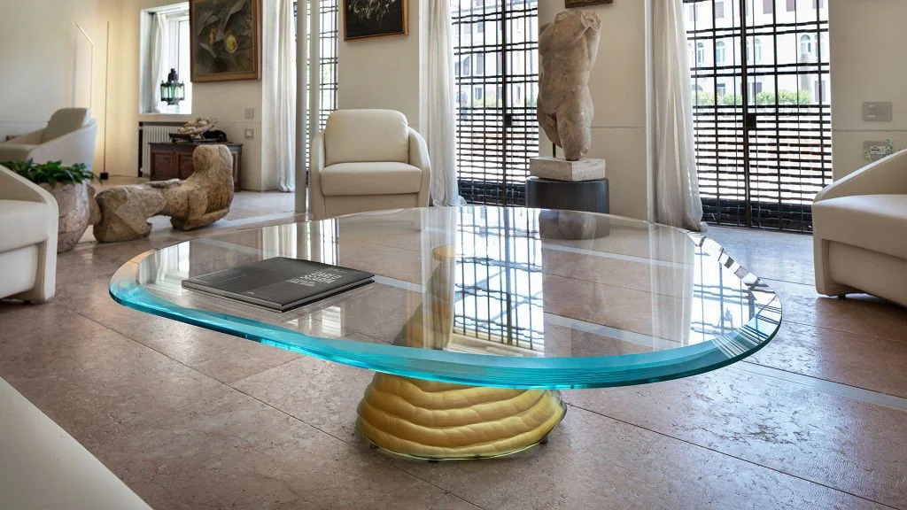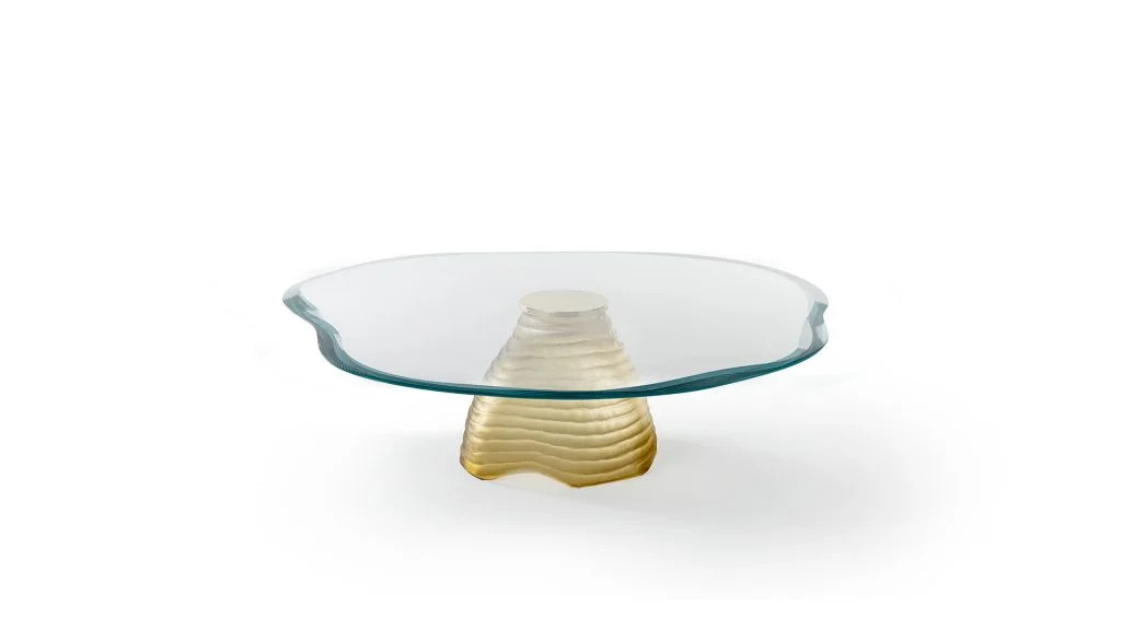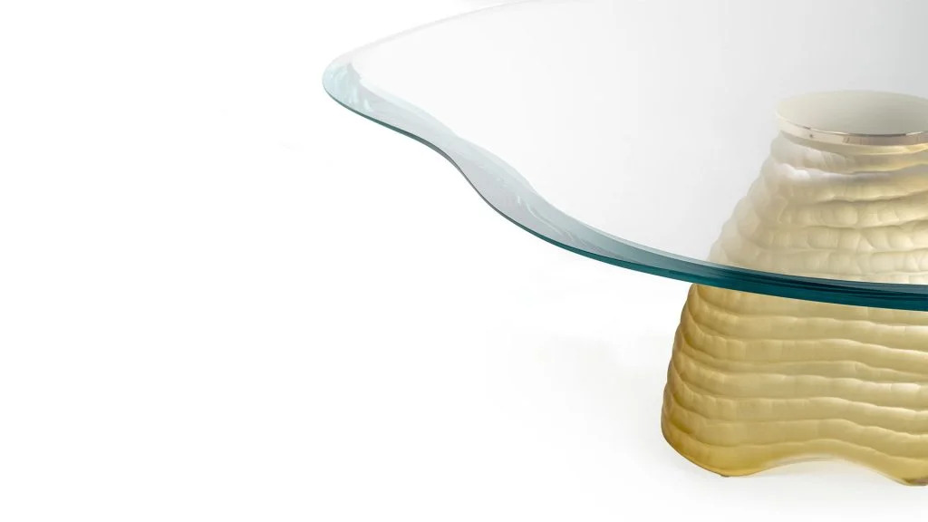 Tavolino con basamento fatto a mano in vetro di Murano colore ambra. Piano in vetro extrachiaro con doppia bisellatura.