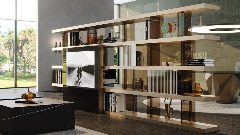 Libreria modulare a incastro con divisori in vetro fumè o vetro bronzo e ripiani in legno. Modulo aggiuntivo con ante in vetro bronzo o fumè con incisioni London.