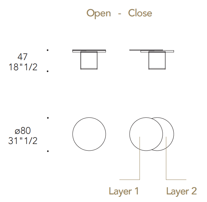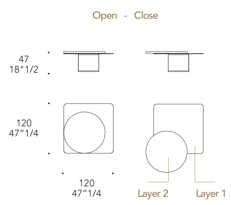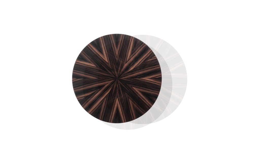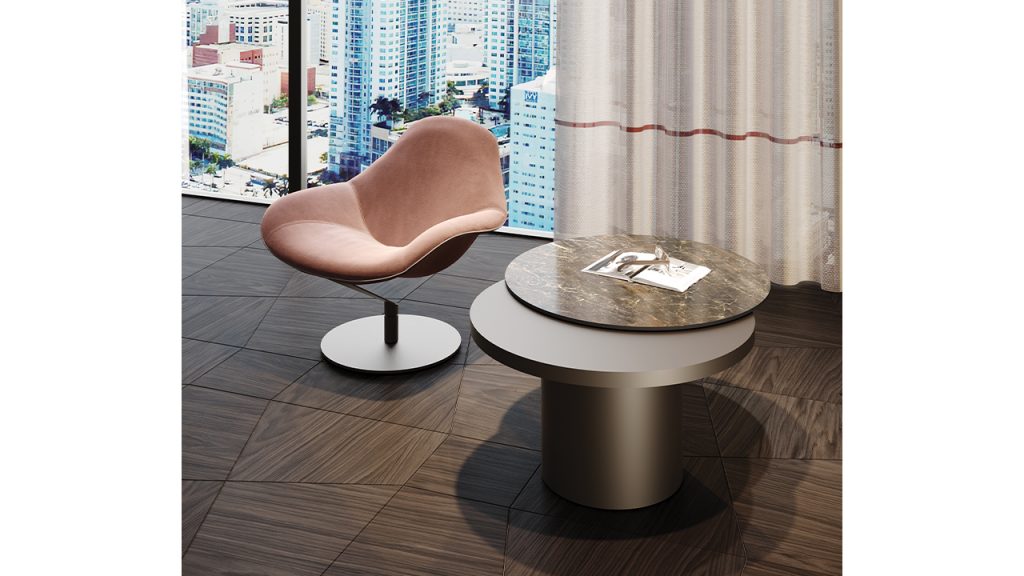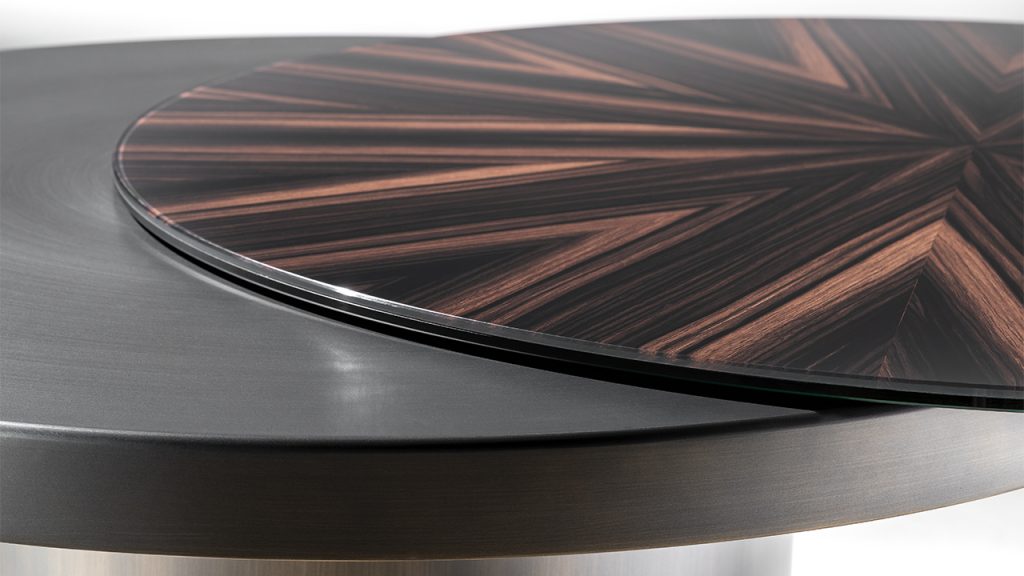 Tavolino con base a cilindro nelle finiture metalliche Bronze, ottone, ottone dark e titanium. Doppio top, uno sp. 40mm in tinta con il cilindro e uno con meccanismo girevole per il superiore, disponibile anche nelle finiture di vetromarmo MarmoReflex e vetrolegno LegnoReflex.
