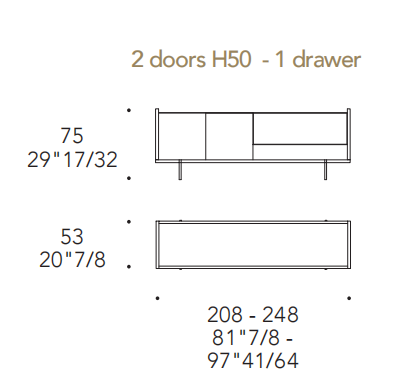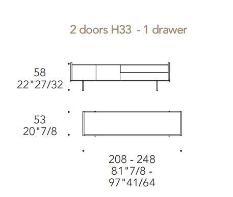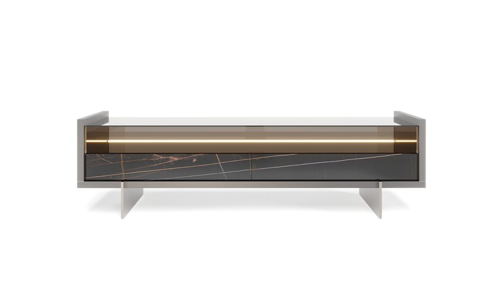 Ante e cassetti in MarmoReflex o LegnoReflex. Vano a giorno in Vetro Bronzo con vetro a specchio bronzo o in Vetro Fumè con vetro a specchio fumè.