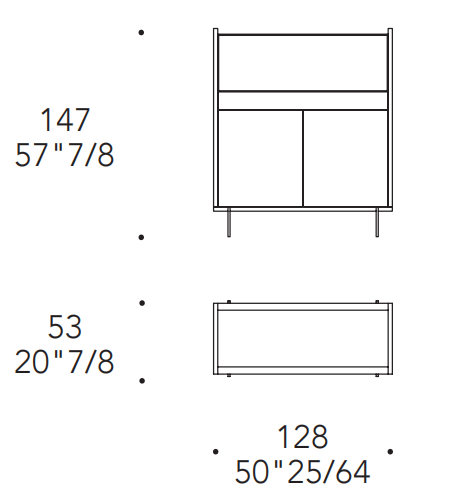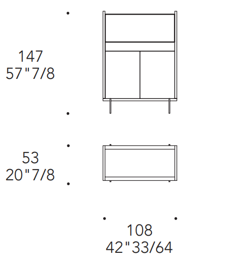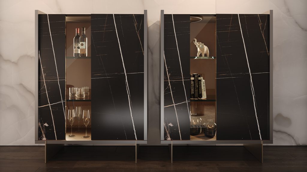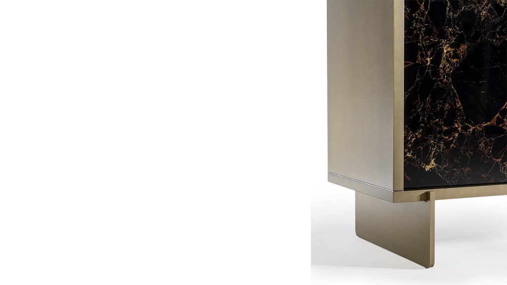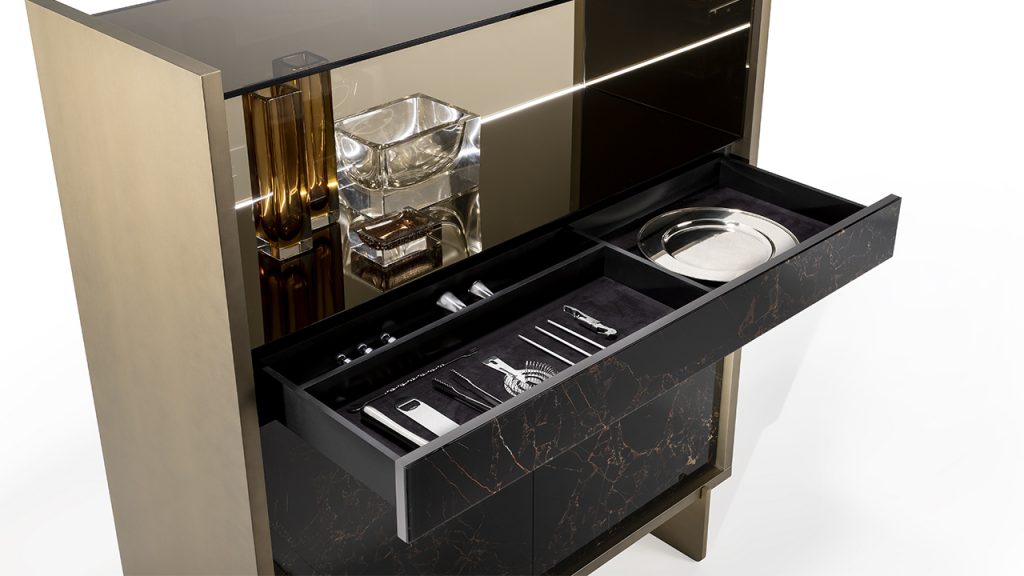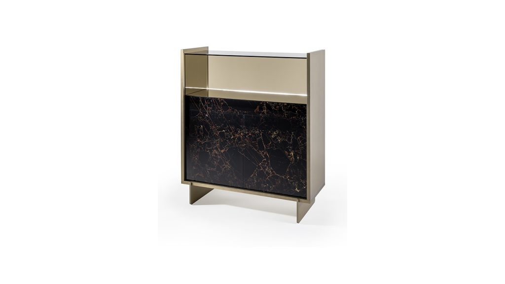 Ante e cassetti in Marmoreflex/Legnoreflex. Teca superiore in vetro bronzo o vetro fumé con illuminazione LED.