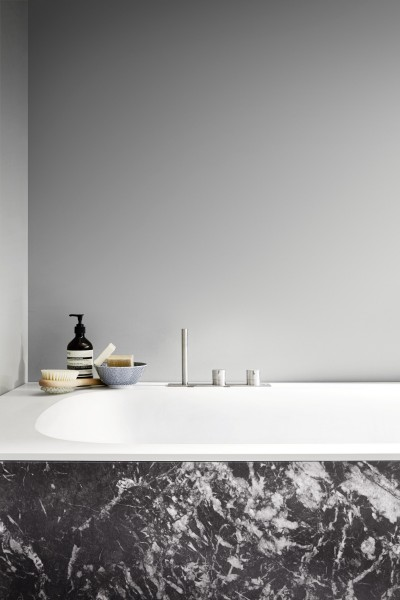 Wall cabinet with 45° cut doors and open element. Carcase and doors are in the same finish. The back of open elements is available in a light or dark decorative, otherwise it is available a paneling in matt lacquered, caly or Corian on demand.