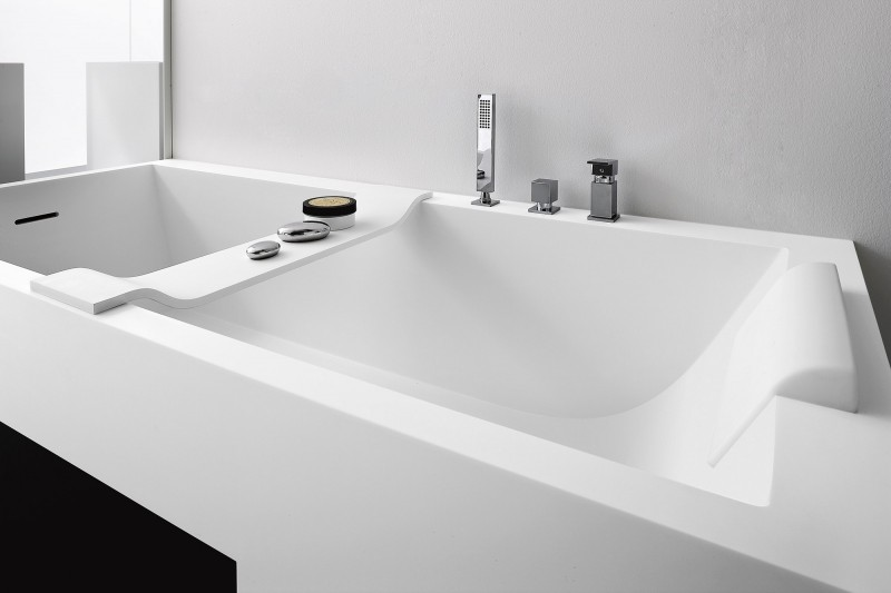 Una geometria nitida definisce la vasca Unico squadrata in Corian, disponibile in tutti i colori a listino. Può essere accessoriata con tutti i sistemi benessere.