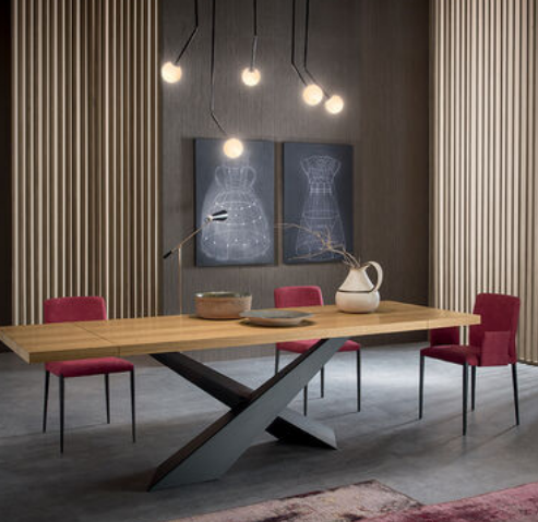 Il tavolo Atlante è interamente in legno, disponibile nelle finiture noce canaletto e rovere coke termo-trattato. Le gambe a cavalletto della larghezza di 17 cm gli conferiscono un aspetto maestoso. La bisellatura del piano mette in risalto le calde venature del legno. Il tavolo è dotato di un sistema di allunghe con guide in alluminio anodizzato. Le allunghe, da 40 cm, sono interne in biglia con il