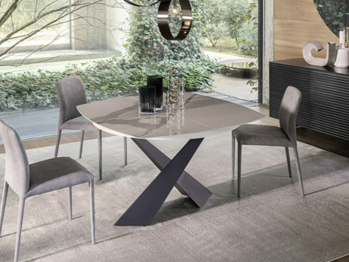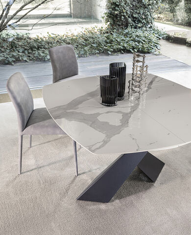 Il tavolo Atlante è interamente in legno, disponibile nelle finiture noce canaletto e rovere coke termo-trattato. Le gambe a cavalletto della larghezza di 17 cm gli conferiscono un aspetto maestoso. La bisellatura del piano mette in risalto le calde venature del legno. Il tavolo è dotato di un sistema di allunghe con guide in alluminio anodizzato. Le allunghe, da 40 cm, sono interne in biglia con il