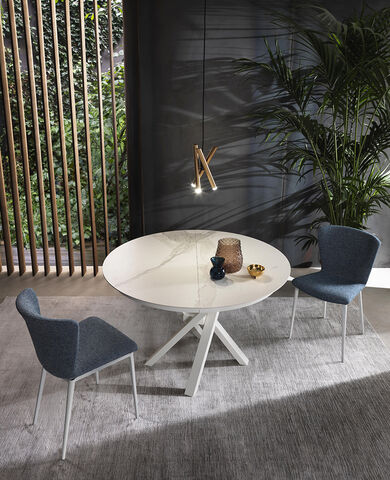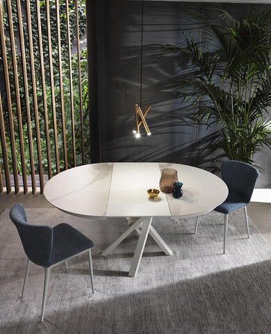 Il tavolo Atlante è interamente in legno, disponibile nelle finiture noce canaletto e rovere coke termo-trattato. Le gambe a cavalletto della larghezza di 17 cm gli conferiscono un aspetto maestoso. La bisellatura del piano mette in risalto le calde venature del legno. Il tavolo è dotato di un sistema di allunghe con guide in alluminio anodizzato. Le allunghe, da 40 cm, sono interne in biglia con il