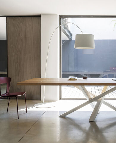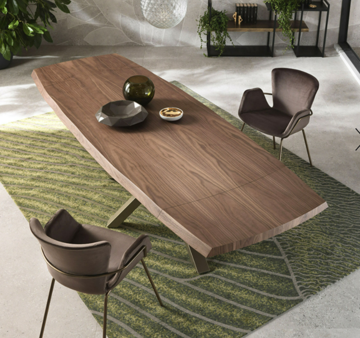 Il tavolo Atlante è interamente in legno, disponibile nelle finiture noce canaletto e rovere coke termo-trattato. Le gambe a cavalletto della larghezza di 17 cm gli conferiscono un aspetto maestoso. La bisellatura del piano mette in risalto le calde venature del legno. Il tavolo è dotato di un sistema di allunghe con guide in alluminio anodizzato. Le allunghe, da 40 cm, sono interne in biglia con il