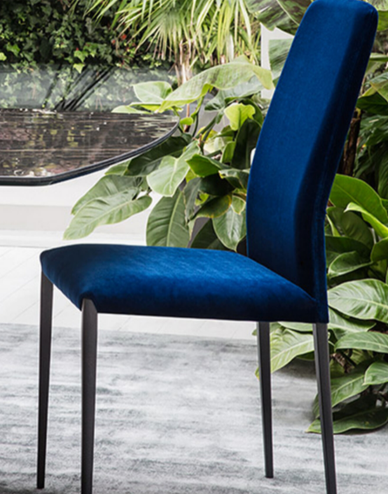 La sedia Anna è interamente rivestita, ha una struttura in acciaio e lo schienale e la seduta sono imbottiti e non sfoderabili. Sul retro presenta una cerniera decorativa. Rivestimenti in tessuto, pelle, similpelle, econabuk, smacchia e velluto