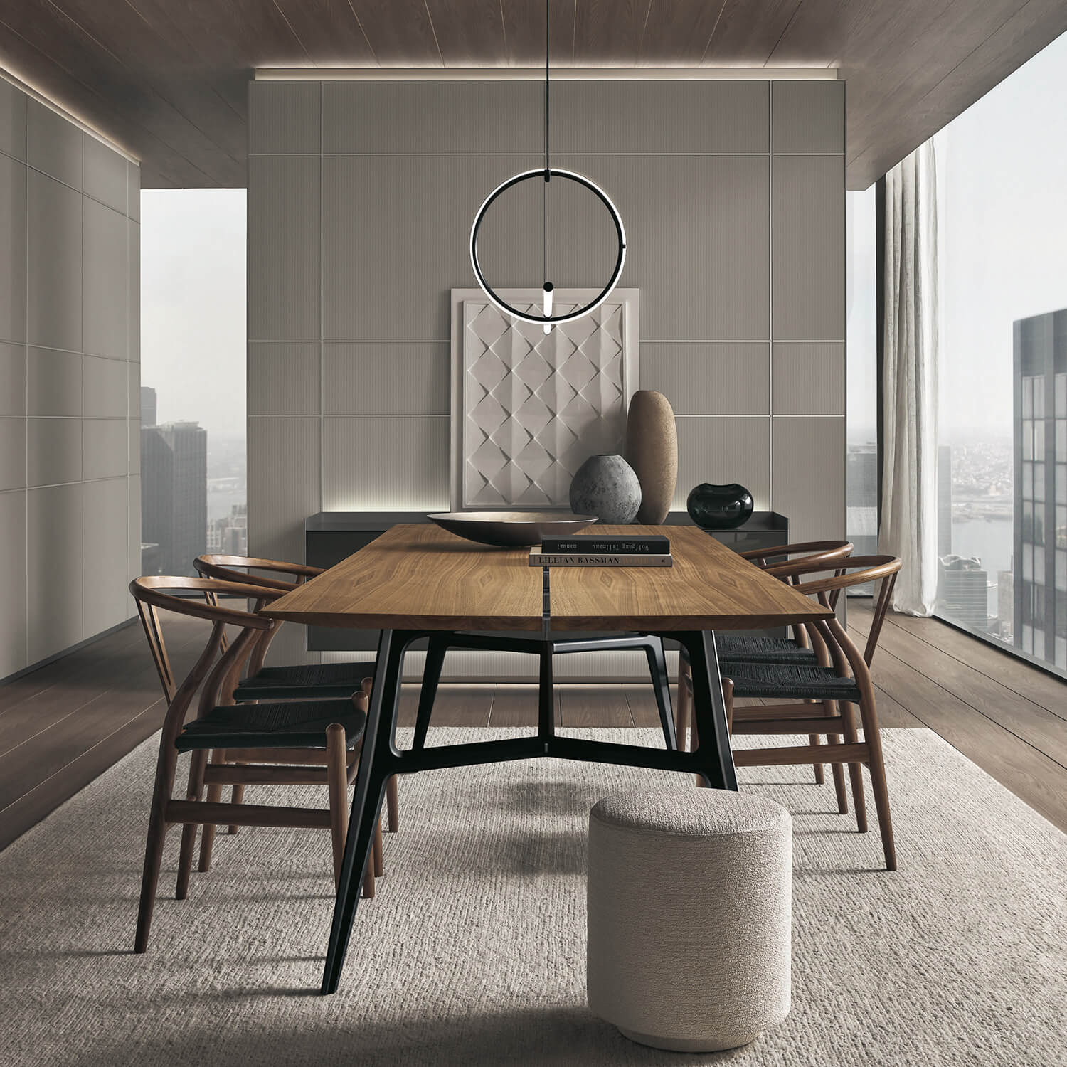 Interpretazione in chiave contemporanea degli antichi tavoli da refettorio, il progetto di Francis si basa su una struttura in alluminio pressofuso con gambe e tirante a sezione ottagonale, concepita per garantire la stabilità nelle diverse dimensioni disponibili nei formati rettangolare, tondo e quadrato.