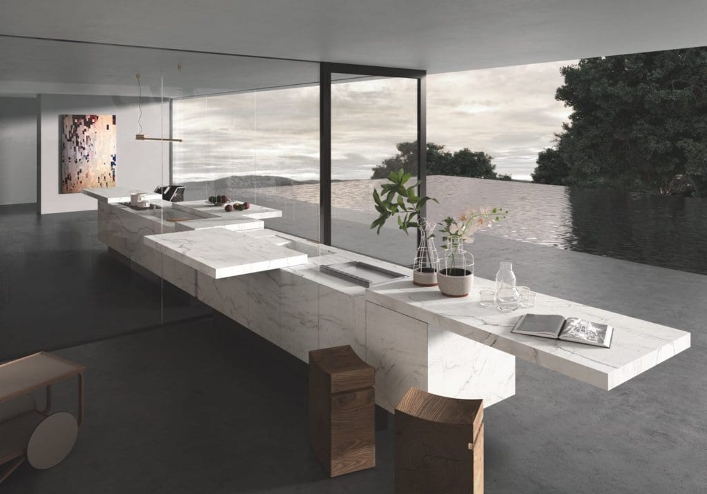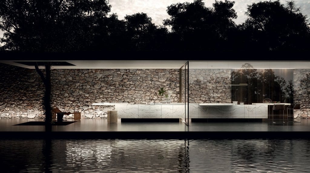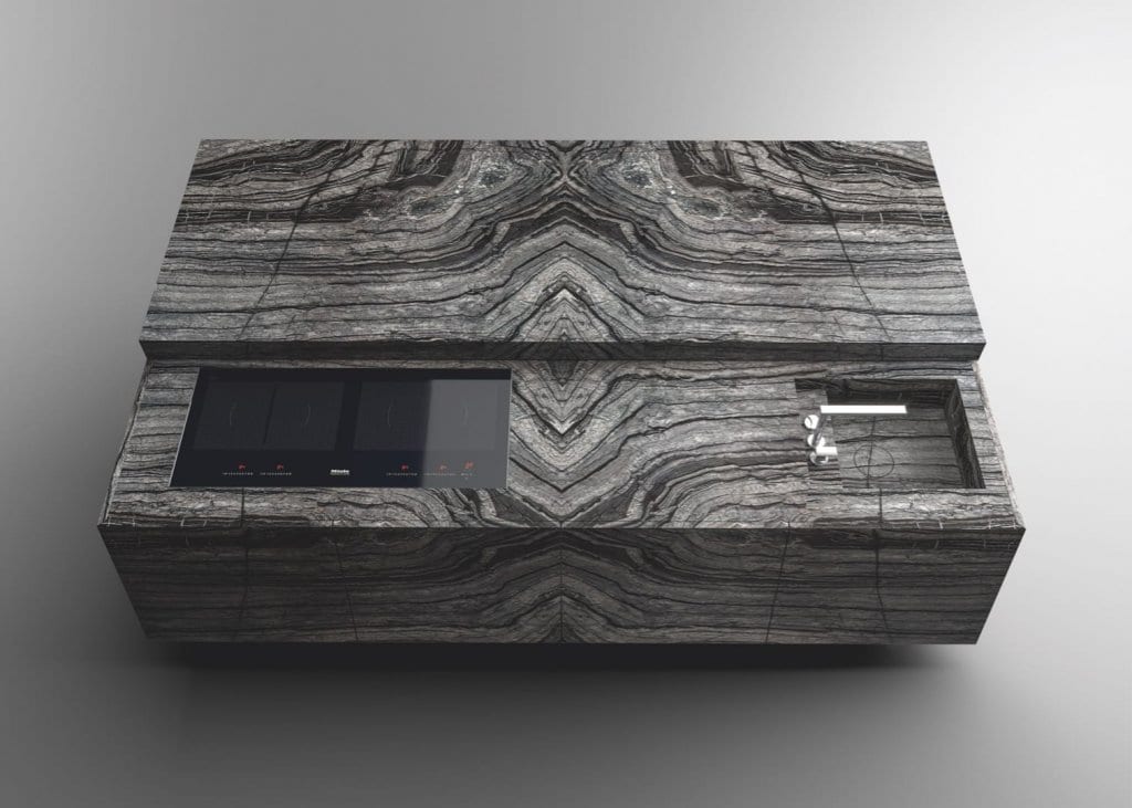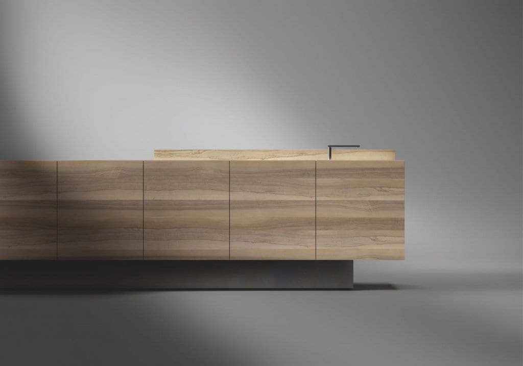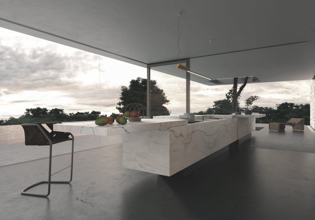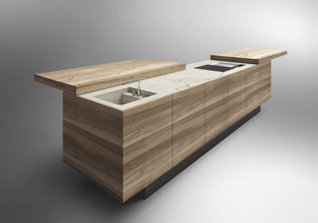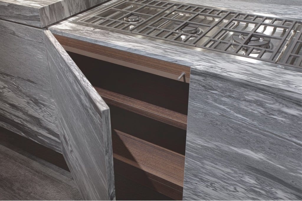 K-IN e K-OUT progettate dall’architetto Massimo Castagna, esteticamente identiche tra loro, sono in realtà molto diverse nel criterio di costruzione in affinità all’uso in interno o in esterno. Un volume essenziale, un unico blocco esclusivamente a isola in pietra o essenza, disponibile in varie conformazioni, dimensioni e finiture. Il modello, molto alzato da terra e con evidente sbalzo delle strutture di sostegno e degli zoccoli, risulta essenziale, quasi primitivo. I grandi top coperchio scorrevoli celano le zone di lavoro della cucina, aprendosi in entrambi i sensi e trasformando il blocco monolitico della cucina chiusa in forma e proporzioni.