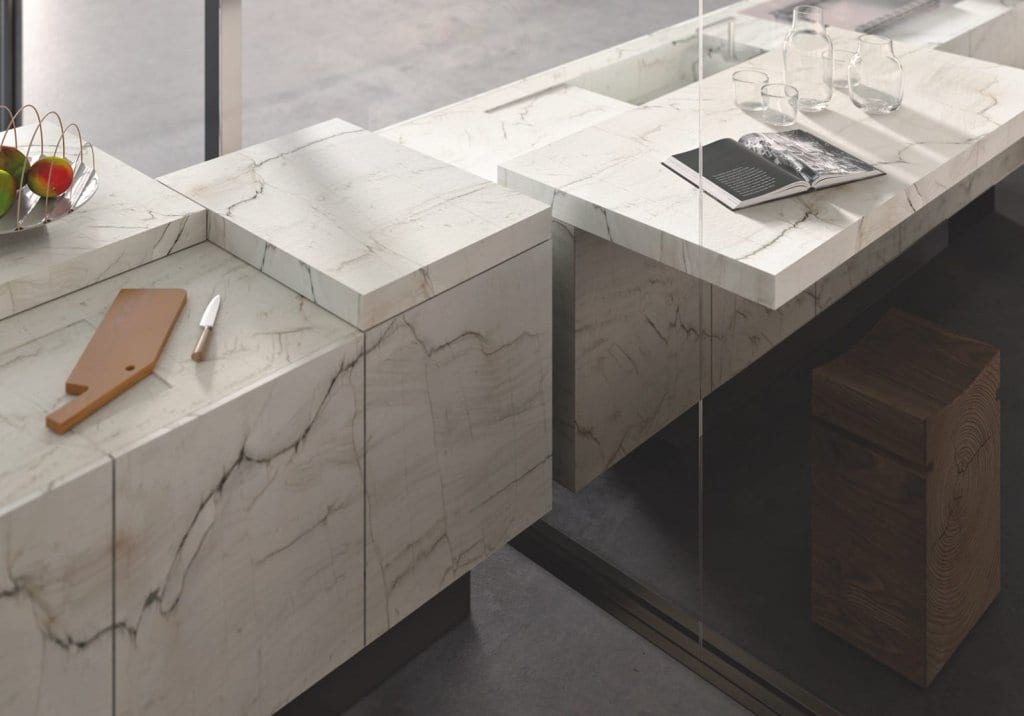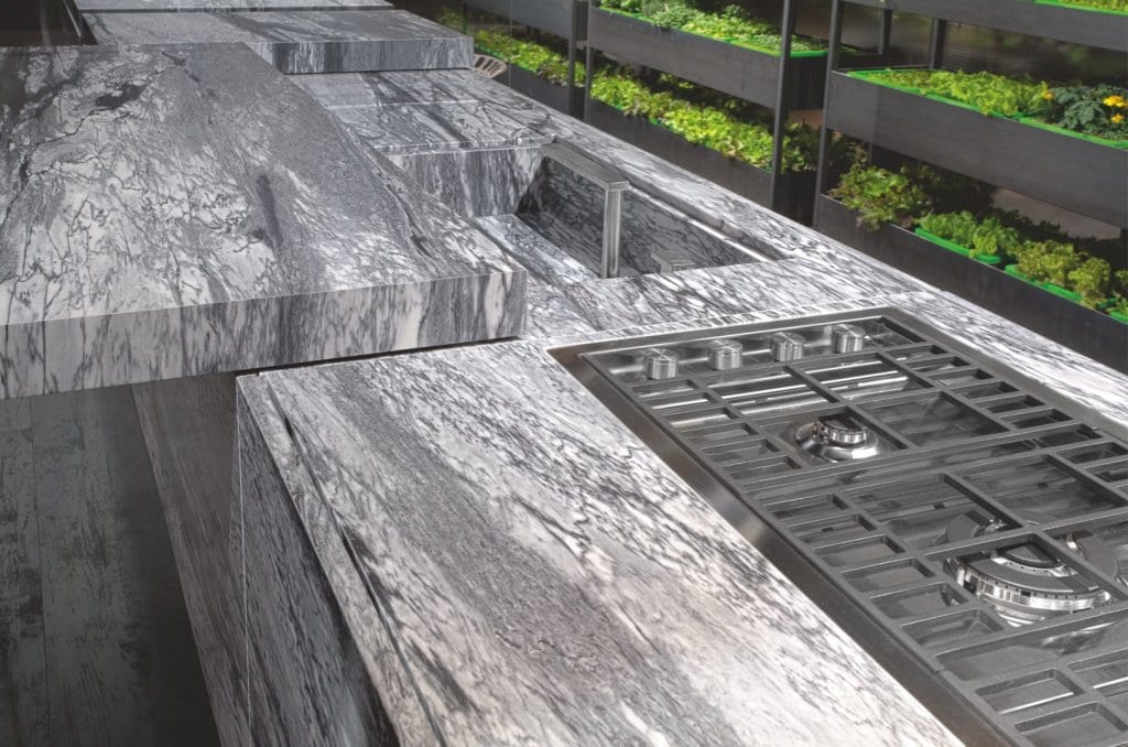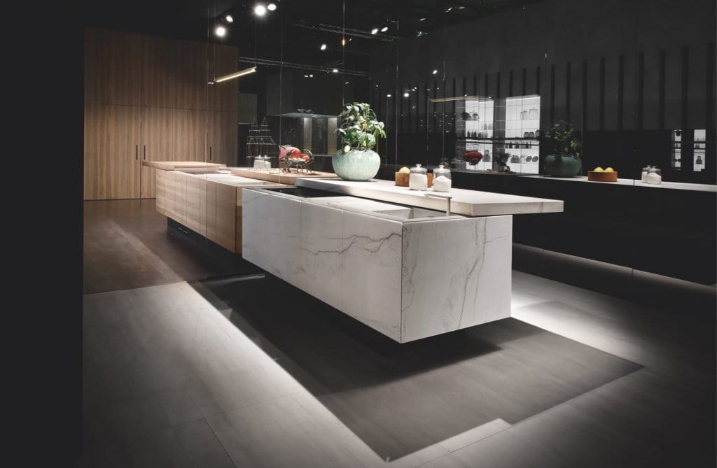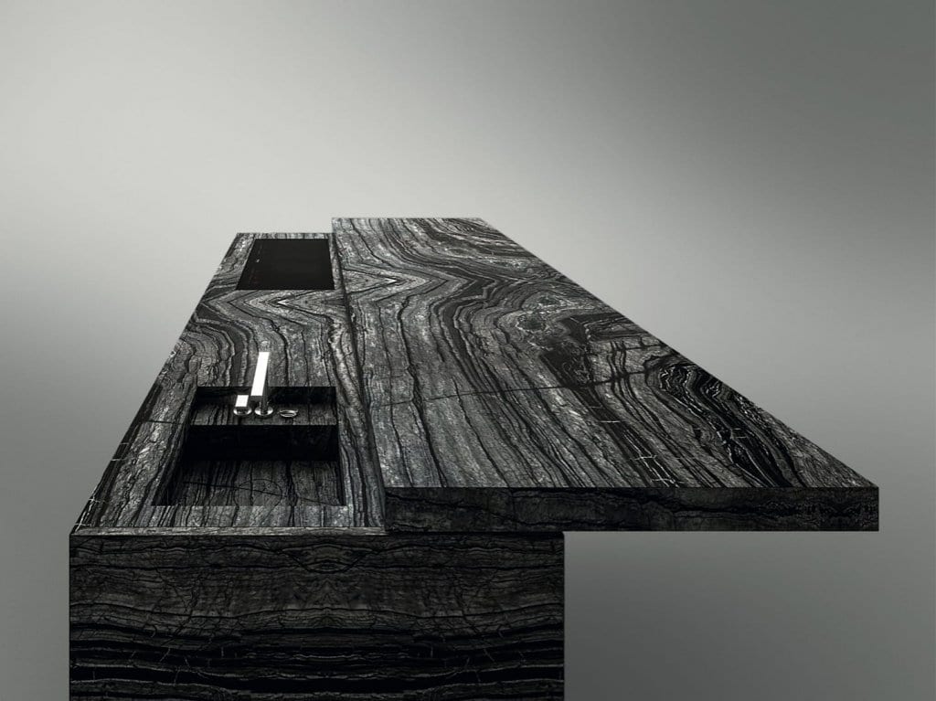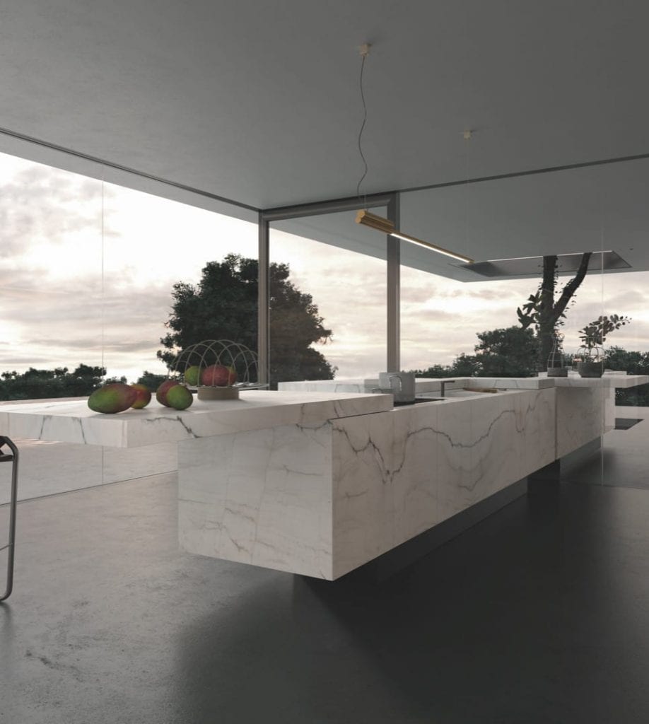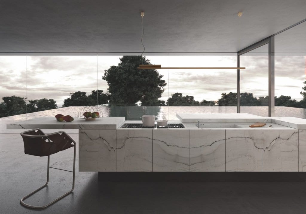 K-IN e K-OUT progettate dall’architetto Massimo Castagna, esteticamente identiche tra loro, sono in realtà molto diverse nel criterio di costruzione in affinità all’uso in interno o in esterno. Un volume essenziale, un unico blocco esclusivamente a isola in pietra o essenza, disponibile in varie conformazioni, dimensioni e finiture. Il modello, molto alzato da terra e con evidente sbalzo delle strutture di sostegno e degli zoccoli, risulta essenziale, quasi primitivo. I grandi top coperchio scorrevoli celano le zone di lavoro della cucina, aprendosi in entrambi i sensi e trasformando il blocco monolitico della cucina chiusa in forma e proporzioni.