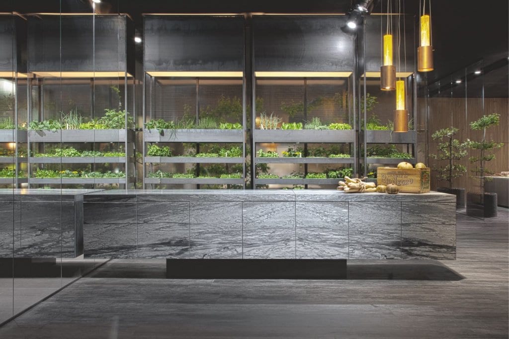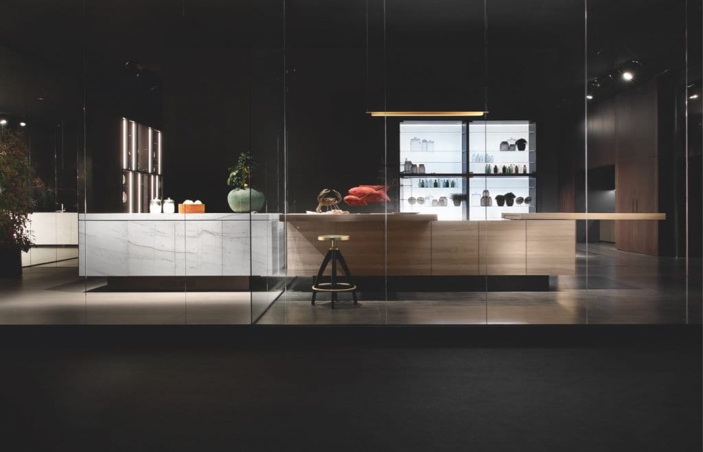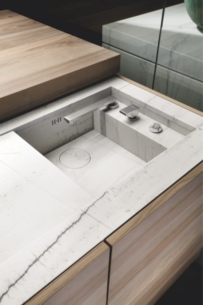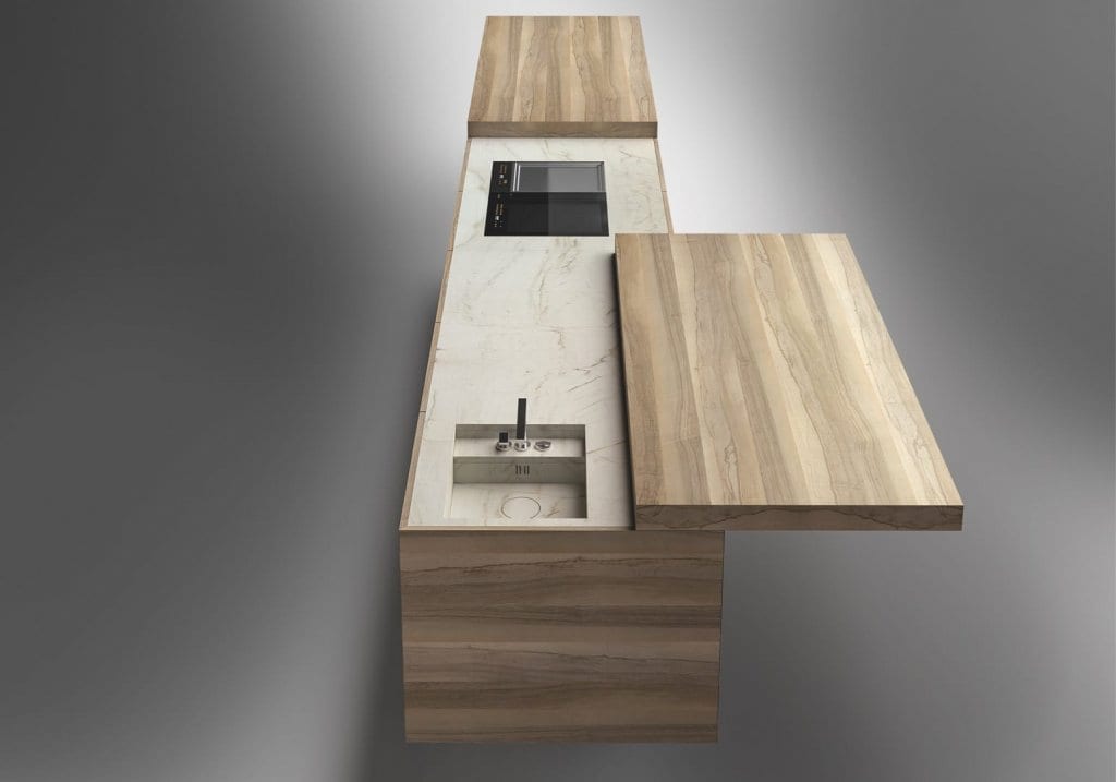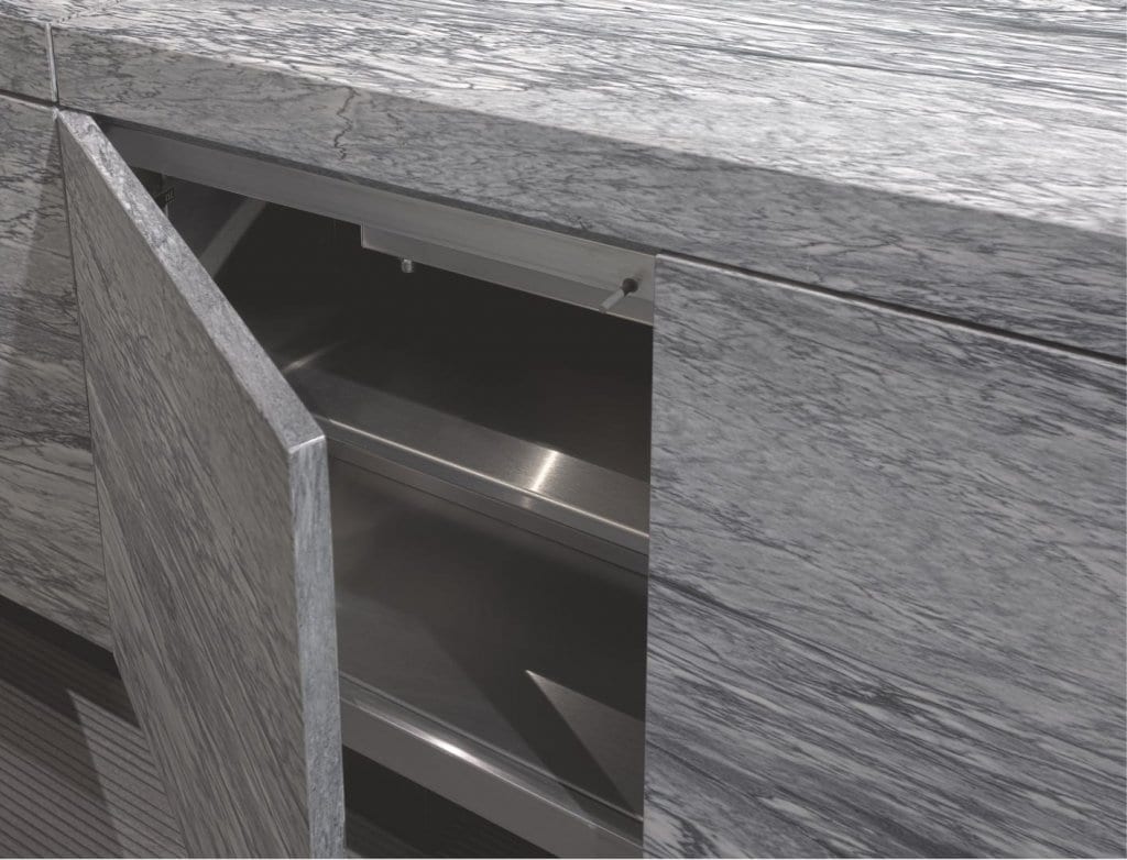 I coperchi diventano piani snack dallo sbalzo importante grazie alle speciali guide scorrevoli. Il movimento funzionante elettricamente grazie ad un sistema a basso voltaggio, permette di nascondere il top interno in cui sono installate cotture e cappe da piano nella versione indoor e i barbecue in quella outdoor. Le due cucine pur essendo visivamente uguali, tanto da poter essere utilizzate in continuità tra loro, sono costruite in modo profondamente diverso in virtù delle performance necessarie alla diversa collocazione: strutture in legno nella versione da interno, alluminio per la struttura da esterno. Un progetto finalizzato a garantire il massimo livello di qualità nella cucina contemporanea.