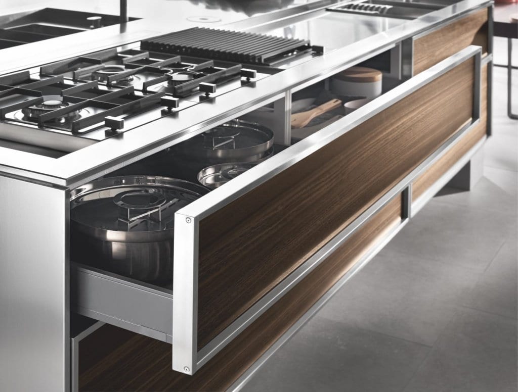 TK38 è la cucina dello chef e di chiunque ami cucinare, un progetto originale di Massimo Castagna che innova l’approccio alla cucina tecnica, superando l’estetica del tutto acciaio. Il modello è pensato per le reali funzioni della preparazione dei cibi, esattamente come avviene in una cucina professionale. Grandi piani di lavoro da personalizzare installando sistemi di cottura differenziati, per soddisfare ogni esigenza di cottura.
