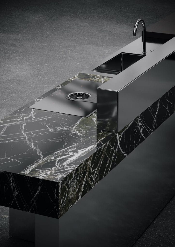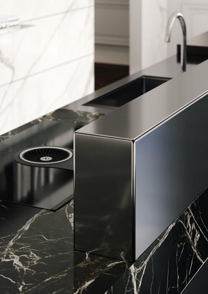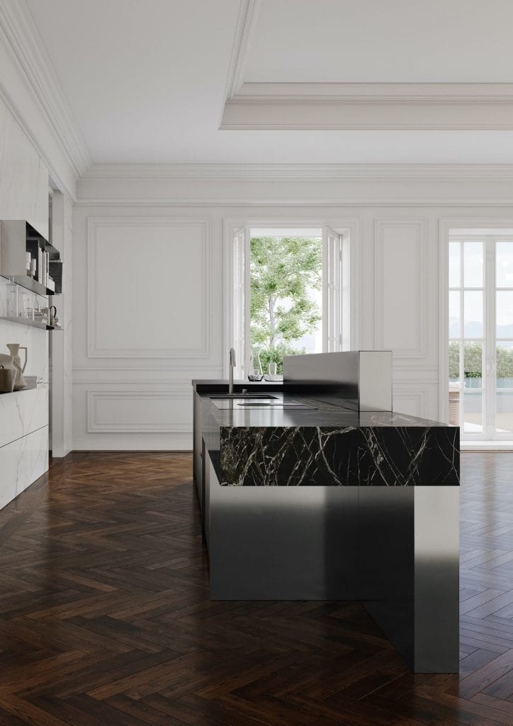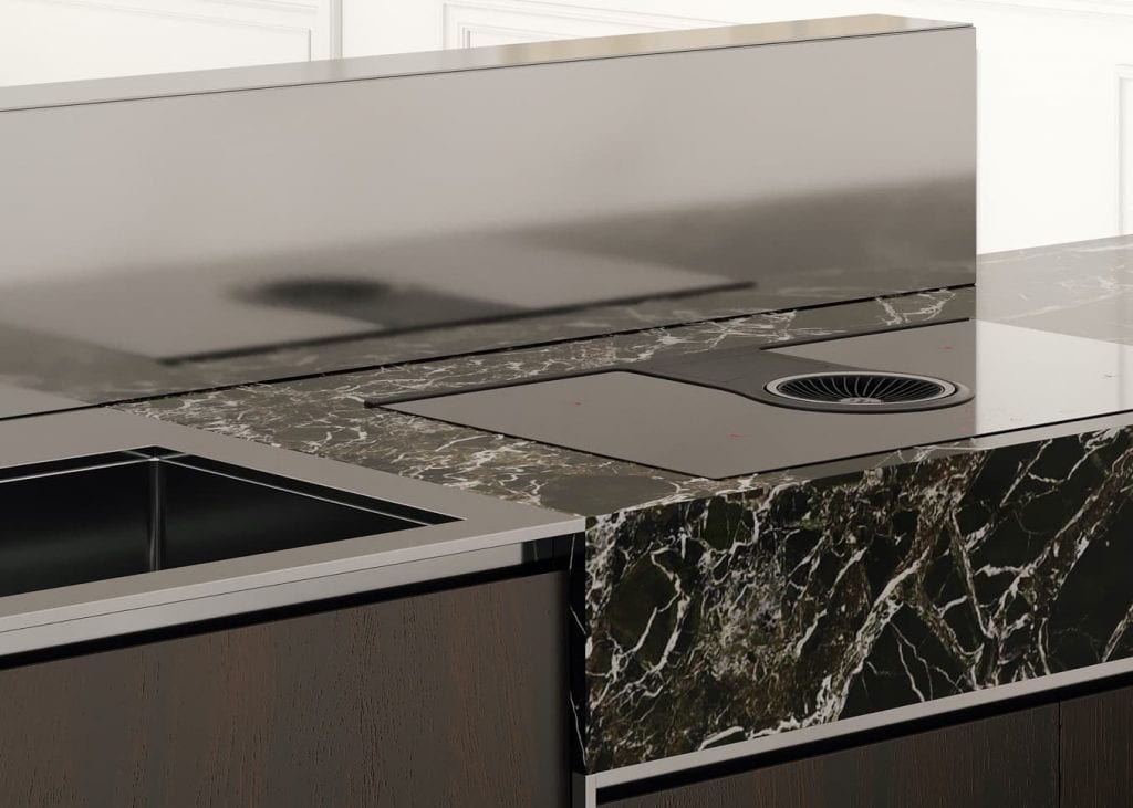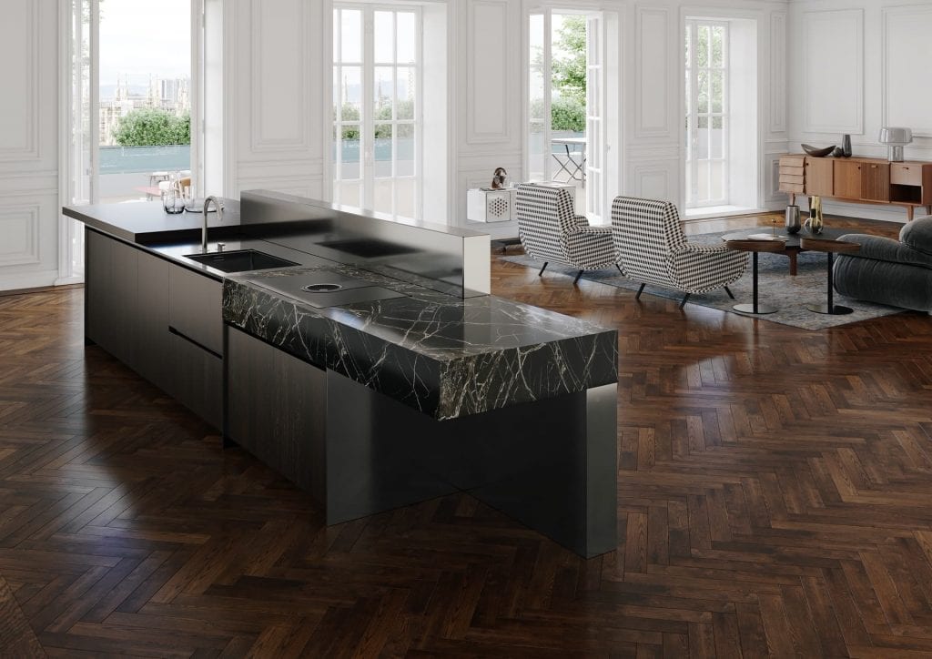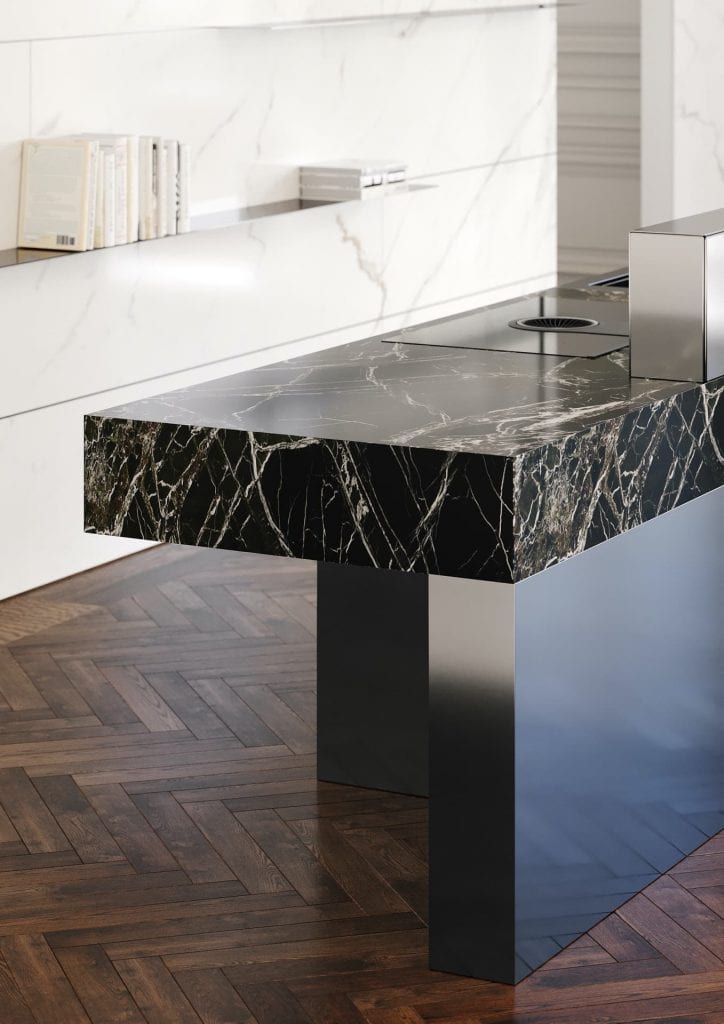IS?LA, elemento architettonico che divide gli spazi con un tratto distintivo e unico. I materiali sul lato living, protagonisti, esaltano la nuova boiserie con mensole in acciaio che, come lame, intersecano il marmo Aria ed evidenziano il gioco di volumi dei top dell’isola. Il lato operativo e funzionale rende protagonisti i nuovi materiali come il Castagno Termotrattato delle ante e del piano snack, il sottile acciaio satinato del top e il marmo Breccia Imperiale del piano ad alto spessore.