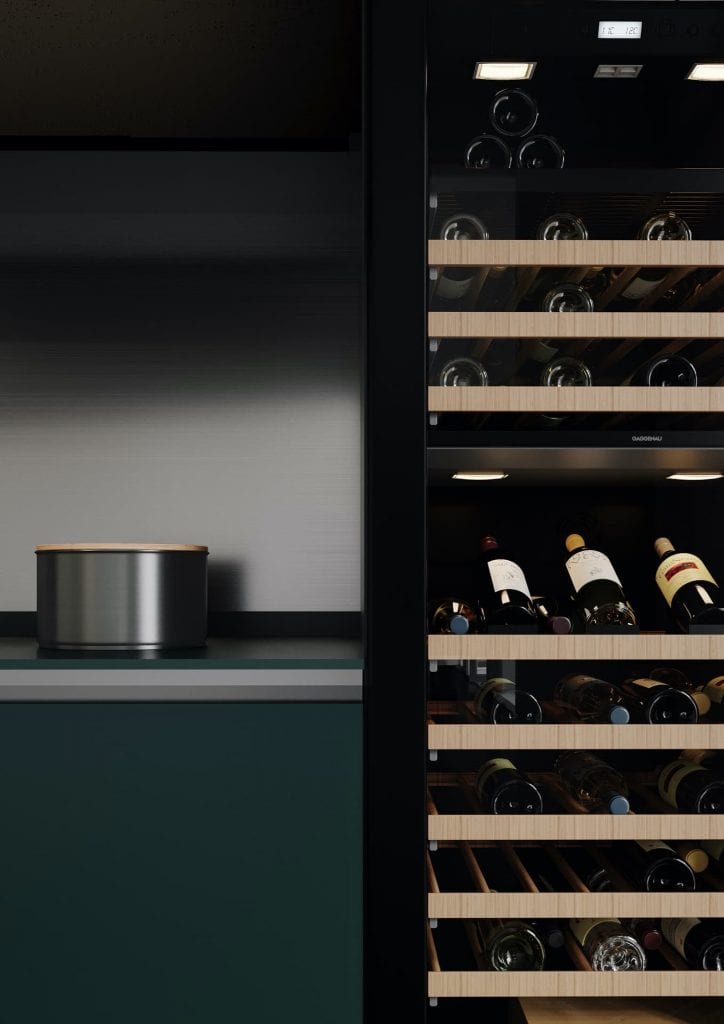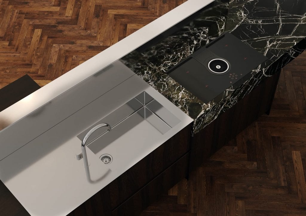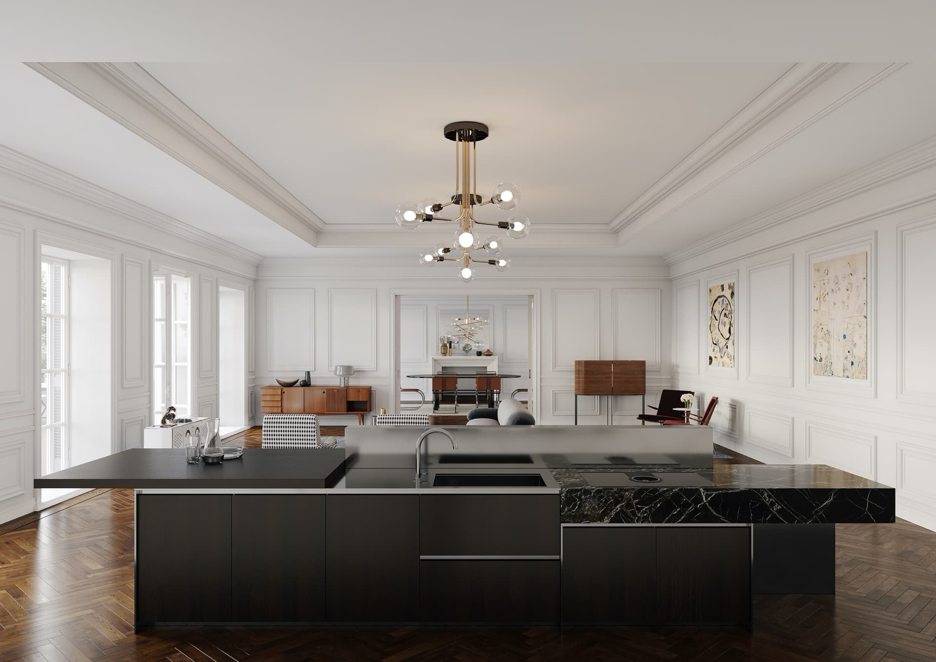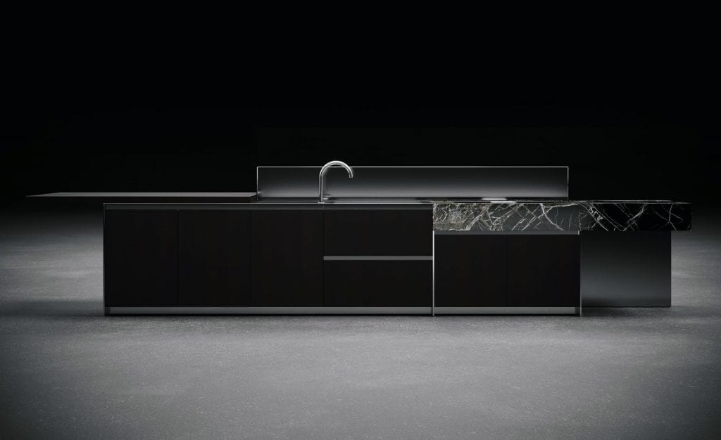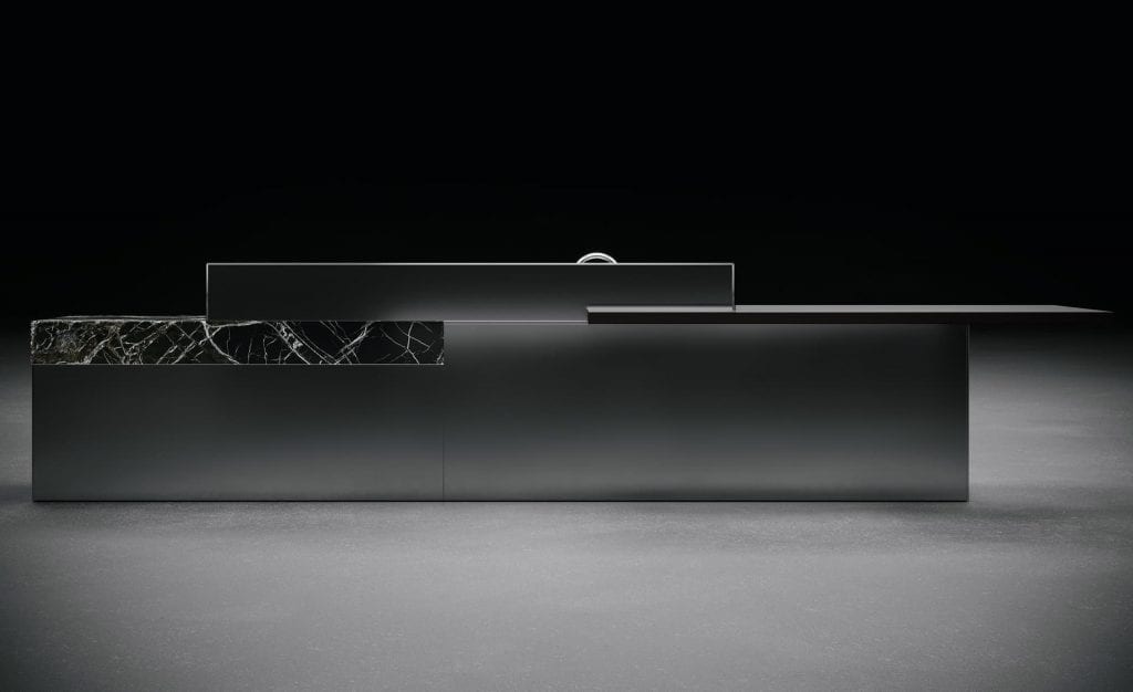 IS?LA, elemento architettonico che divide gli spazi con un tratto distintivo e unico. I materiali sul lato living, protagonisti, esaltano la nuova boiserie con mensole in acciaio che, come lame, intersecano il marmo Aria ed evidenziano il gioco di volumi dei top dell’isola. Il lato operativo e funzionale rende protagonisti i nuovi materiali come il Castagno Termotrattato delle ante e del piano snack, il sottile acciaio satinato del top e il marmo Breccia Imperiale del piano ad alto spessore.