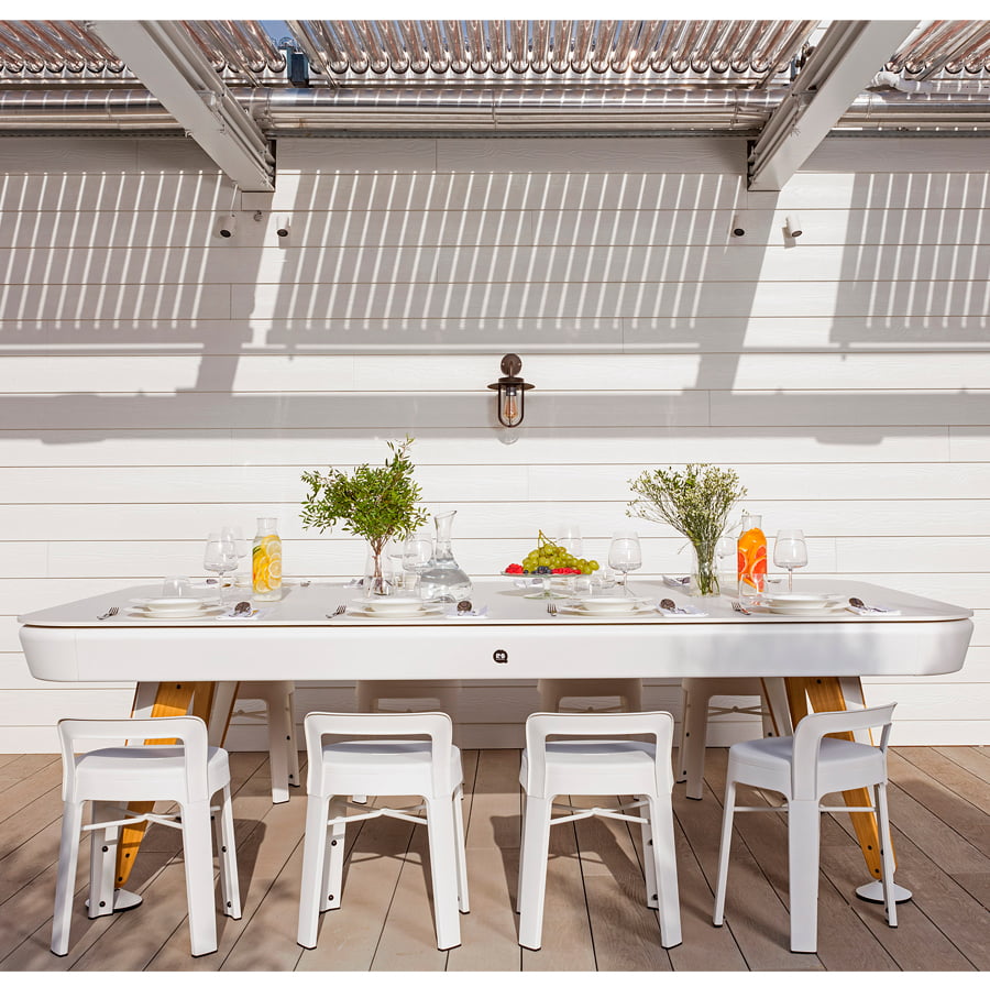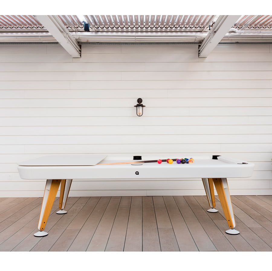 The dining top is available in iroko, walnut or oak wood (for indoor use) or in Fenix (for outdoor use), in the two sizes of the Diagonal pool table. A large dining table. A fabulous pool table.